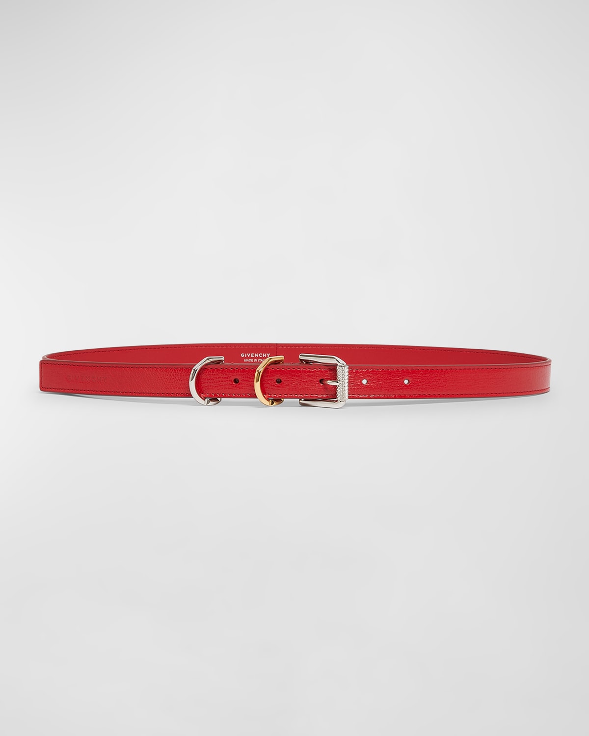 Givenchy "Voyou" skinny belt in leather and brass Features twotone hardware Approx. 0.8"W Cut to size Frame buckle Embossed logo Tonal stitching Made in Italy