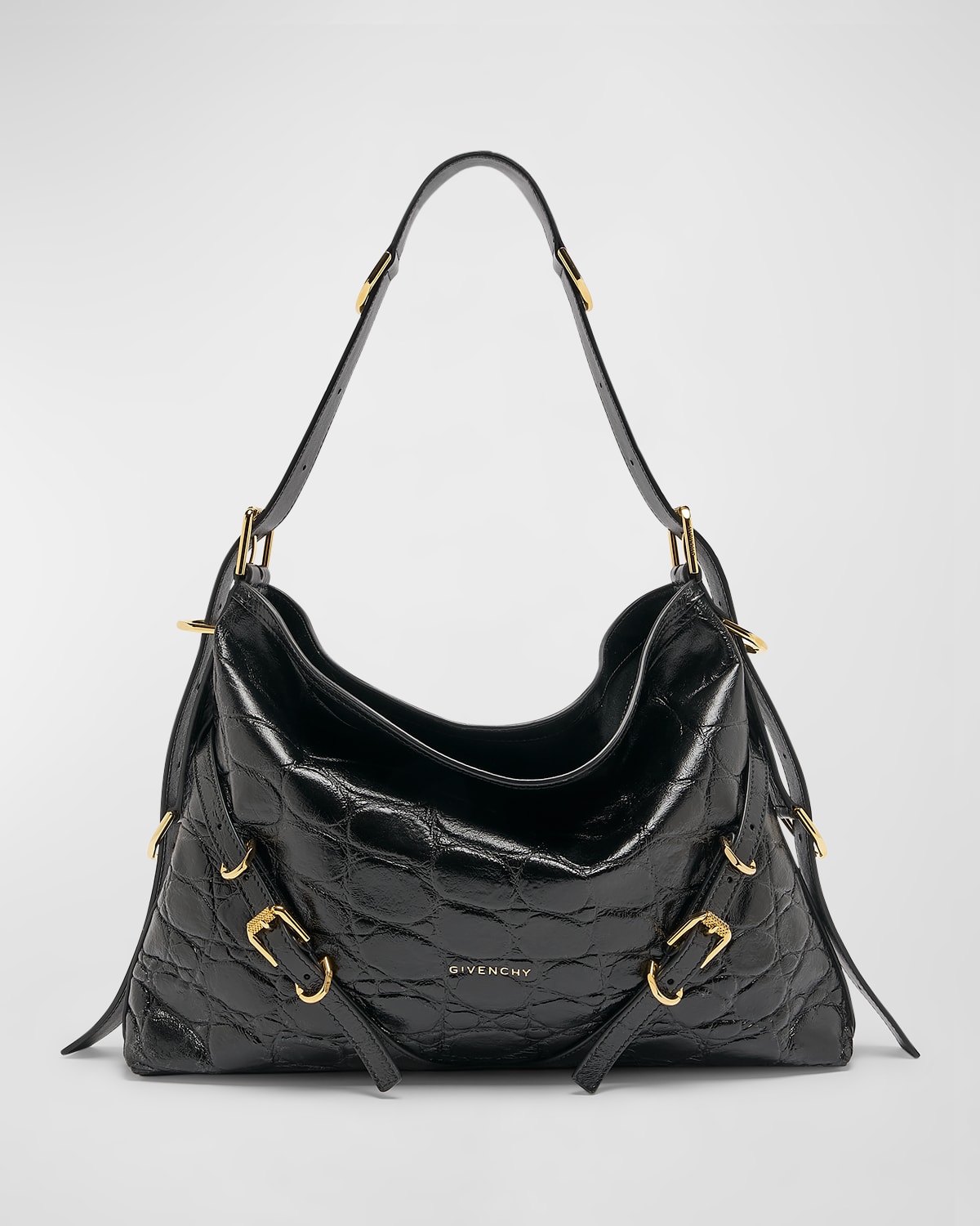 Givenchy "Voyou" slouchy shoulder bag in calfskin leather Adjustable shoulder strap Top zip closure Can be worn as a shoulder bag or crossbody Interior, one main compartment and one zip pocket Approx. 10.6"H x 15.7"W x 2.5"D Lining: Acrylic/cotton Made in Italy