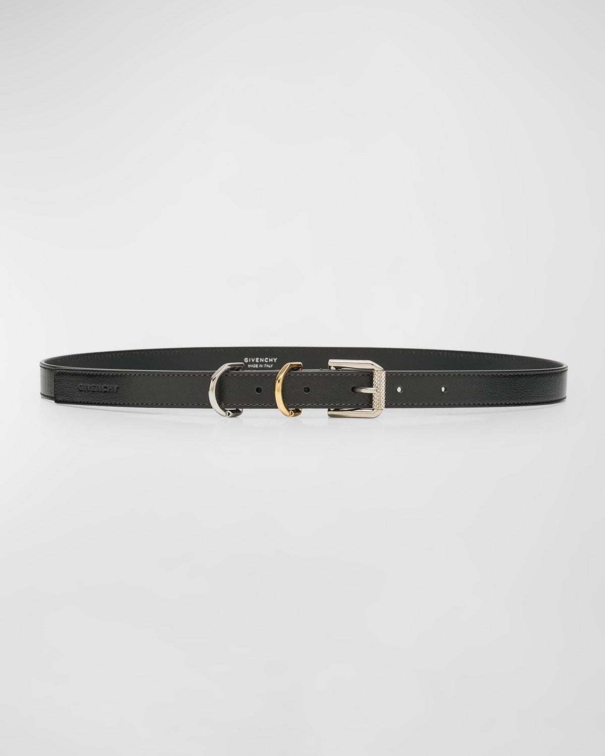 Givenchy "Voyou" skinny belt in leather and brass Adjustable fit Frame buckle Mixed metal hardware Logo accent Tonal stitching Made in Italy