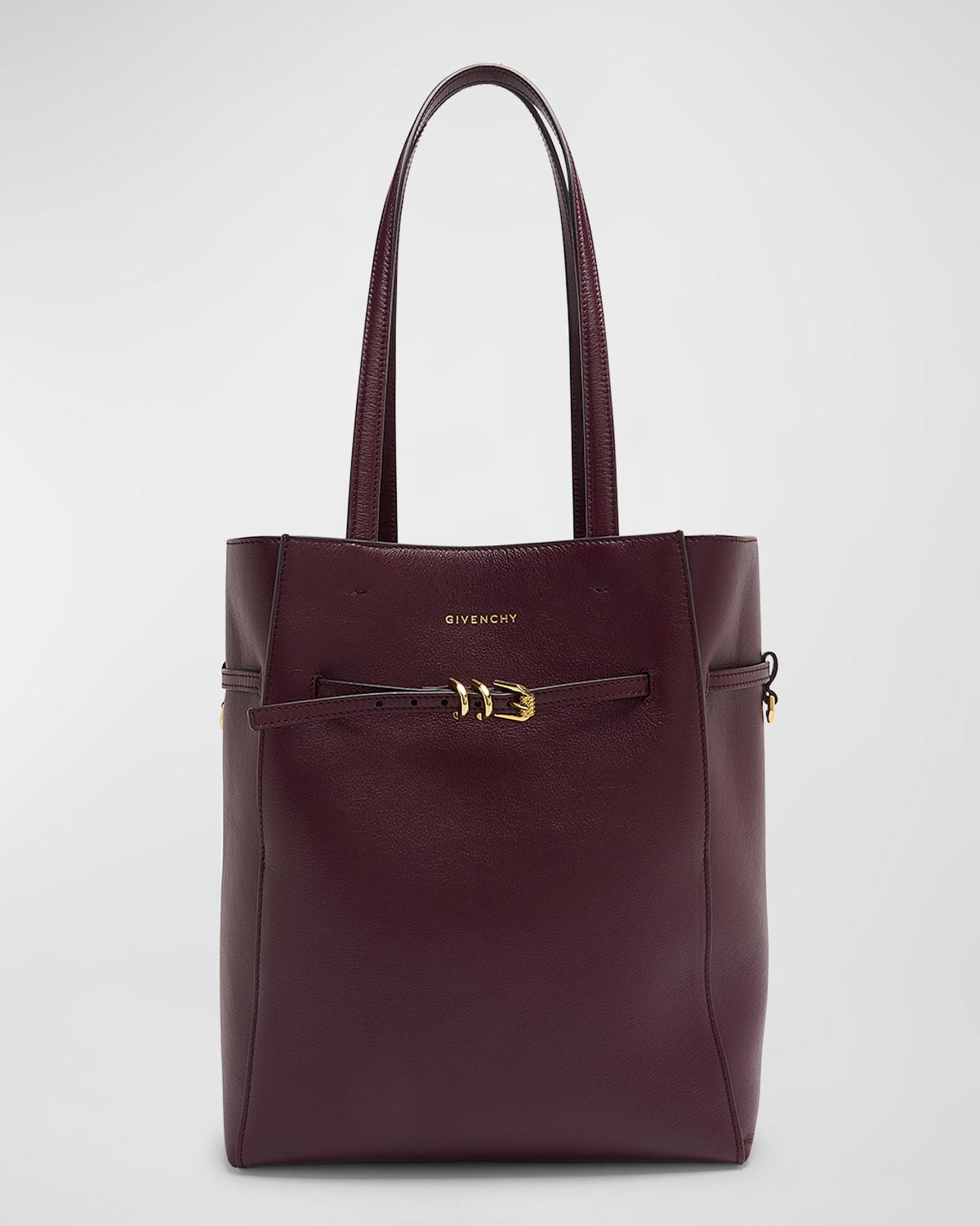 Givenchy "Voyou" northsouth tote bag in leather Shoulder straps Open top Exterior, buckle strap accent Lining: Leather Approx. 12.2"H x 11.8"W x 4.3"D Made in Italy