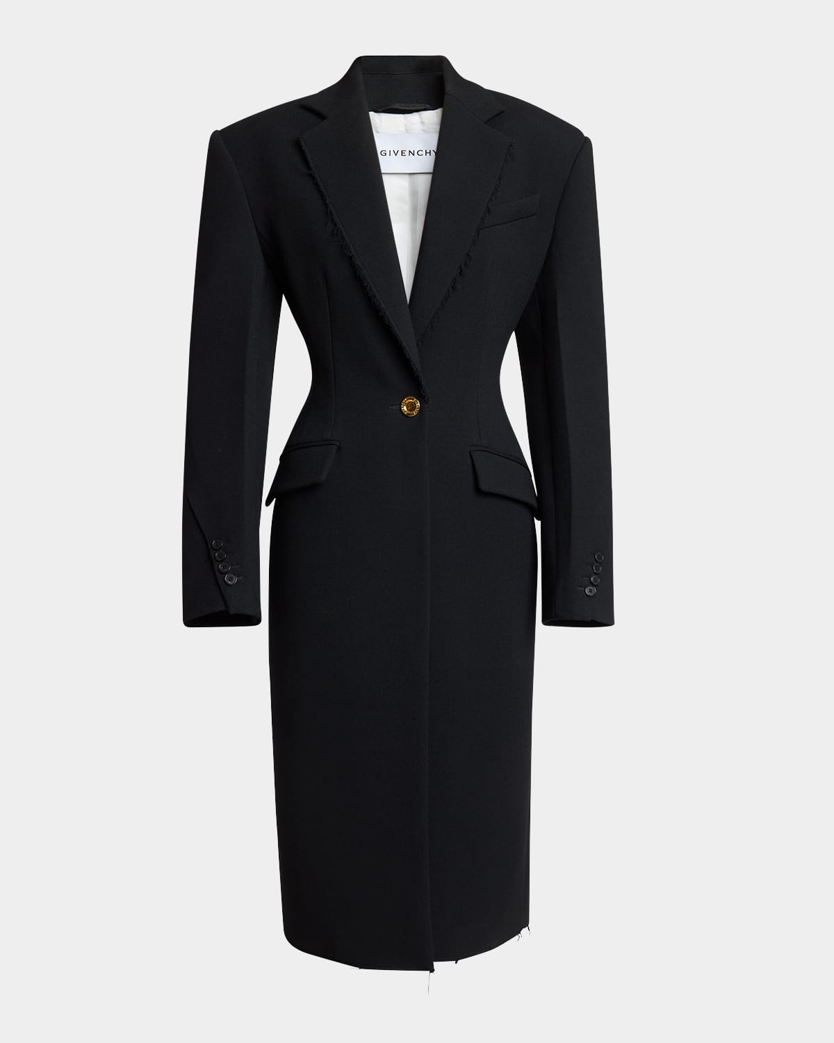 Elevated with a tailored cocoonshaped silhouette, this coat by Givenchy is crafted from a cozy wool blend with rawedge trim Notched lapels; singlebutton front Padded shoulders Long sleeves; button cuffs Single chest welt pocket Hip flap pockets Centercut back vent Hem falls below the knee Wool/nylon/polyamide/viscose Made in Italy