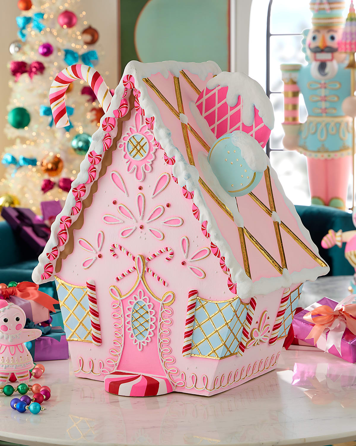 Gingerbread house display featuring candy cane details throughout Handcrafted of handpainted paper mache Approx. 24"L x 15.5"W x 29"T Imported