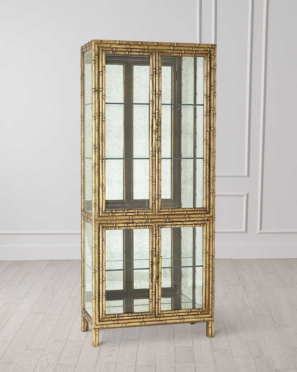The impossibly chic bamboo etagere features beveled glass shelves and an antiqued mirror back. Handcrafted of brassplated iron Overall, approx. 36"W x 20.5"D x 84"T Includes hardware Weight, 458.0 lbs Imported Boxed weight, approximately 500.0 lbs