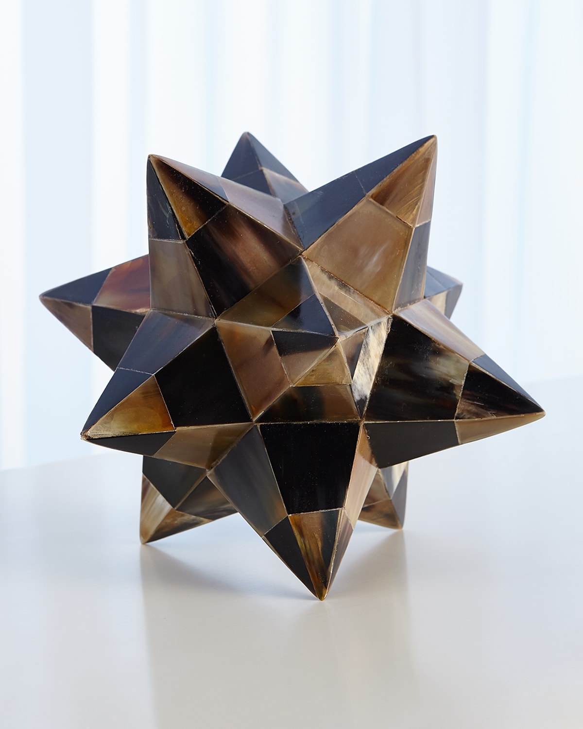 Our Stellated Dodecahedron features a wood composite substrate and horn veneer. The Stellated Dodecahedron is composed of 12 pentagrammic faces, with five pentagrams meeting at each vertex. Water buffalo horn from India. Overall: 7"W x 7"D x 7"T. Weight: 1.7 lbs. Dust with dry cloth. Imported.