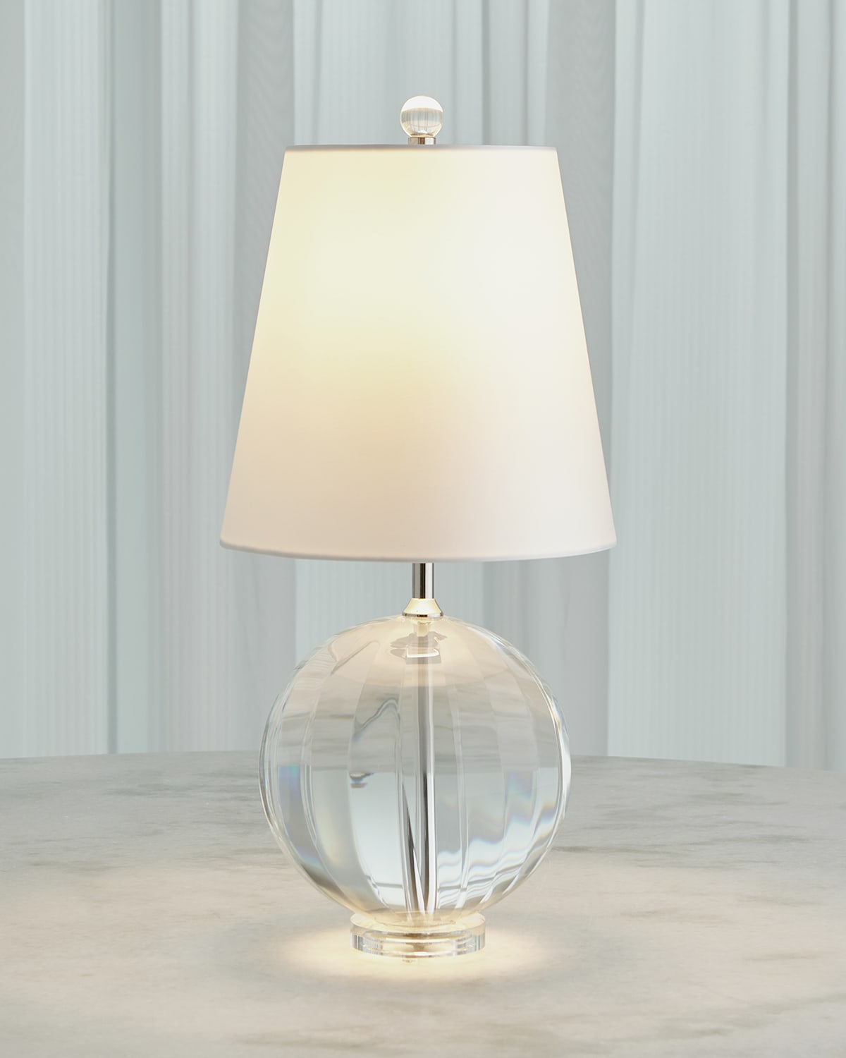 Our crystal faceted Lady Lamp is the perfect size for a bar or desk. Crafted from a crystal sphere faceted into form with a round silk tapered shade with rolled edges Lamp ships in 1 box Approx. 9"Dia. x 19.5"T Weight, 18.8lbs Sold individually 8 ft. clear silver cord UL listed Uses one 60watt bulb On/off turn knob at socket Wipe clean Imported Boxed weight, approximately 25.0lbs