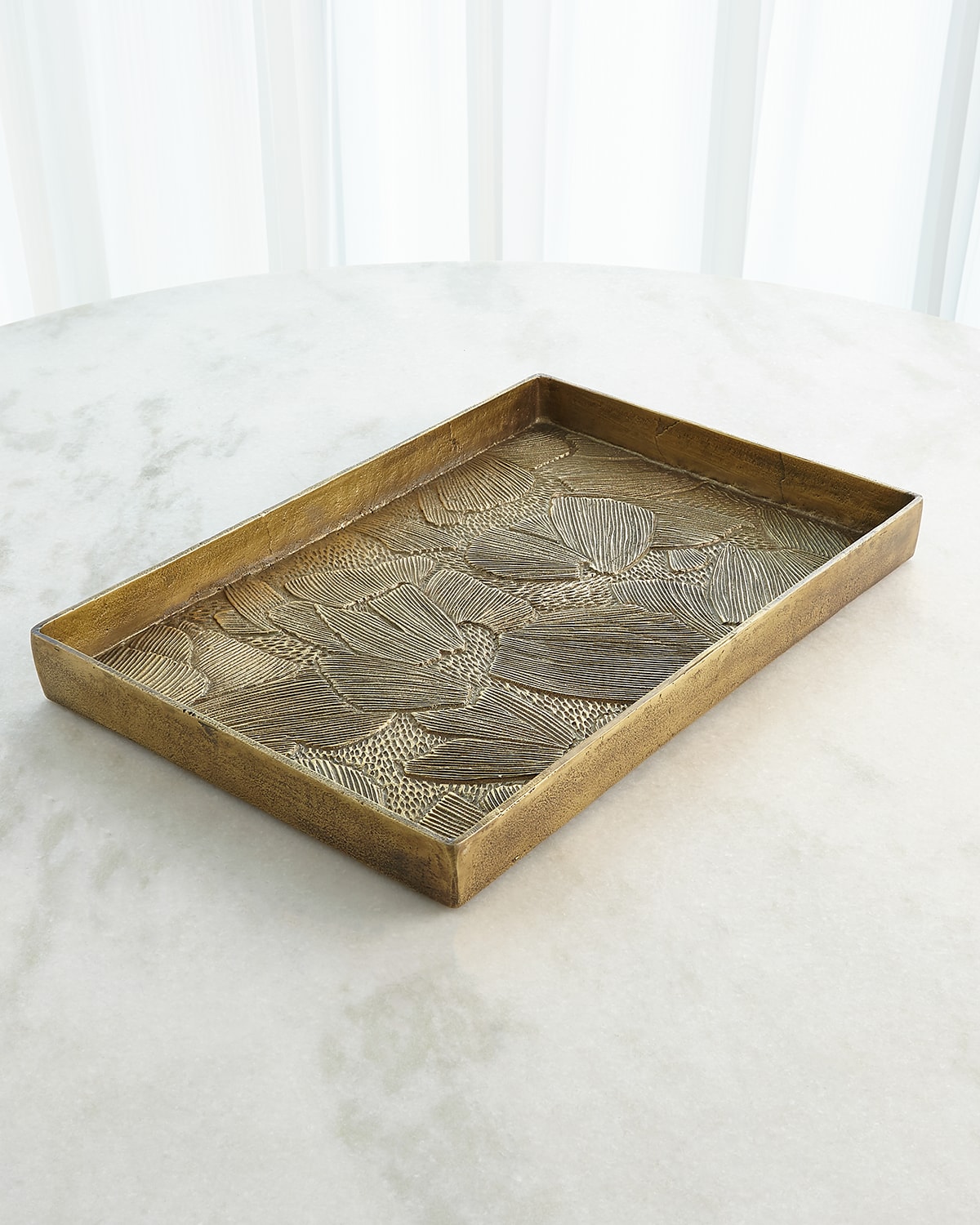 Tray made of aluminum with an antiqued brass finish Approx. 24"L x 16.0"W Item Weight (Lbs.): 14.1 Wipe clean Imported