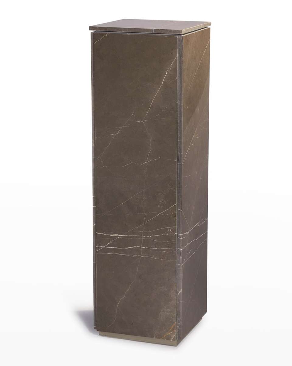 Handcrafted pedestal features grey Turkish marble veined with warm golden and ivory tones Floats on a stainless steel base For indoor use Approx. 13"Dia. x 44.3"T Sold individually Hardware included Assembly not required Item Weight (Lbs.): 169.0 Wipe clean Imported