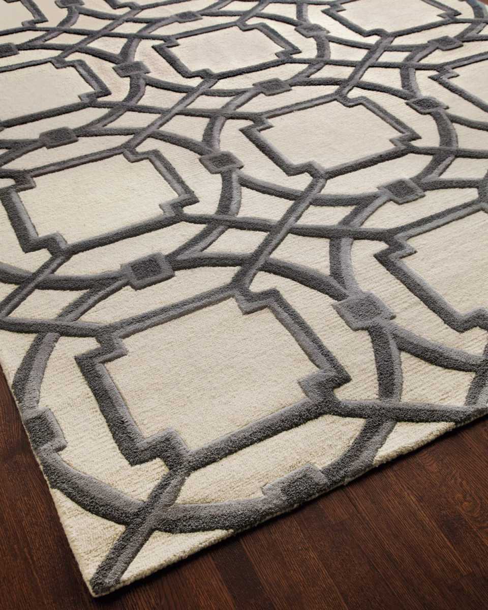 Sharp lines and flowing curves keep the eye moving across this distinctive rug. Hand tufted and hand dyed. Wool with cotton backing. Size is approximate. Imported.