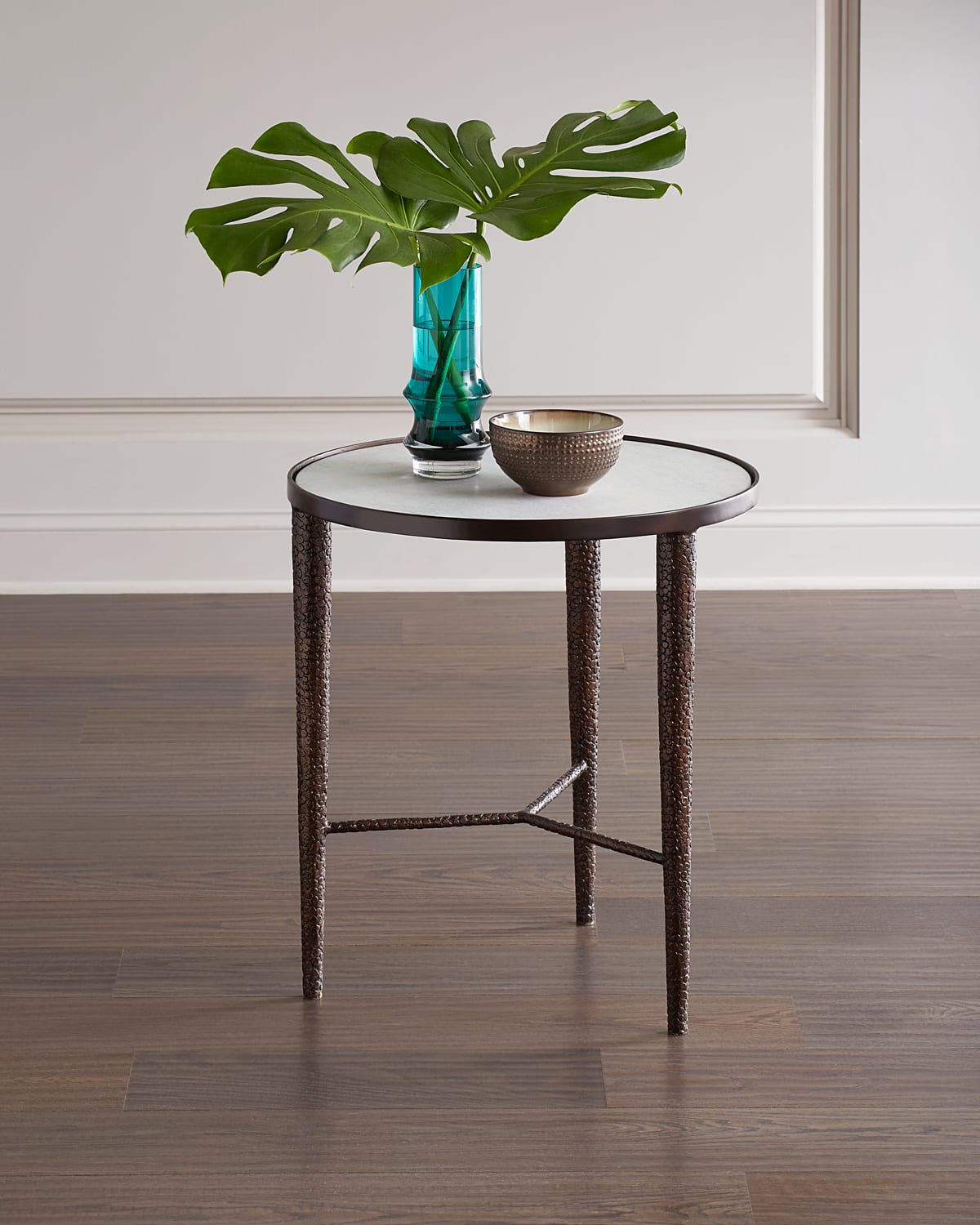 Handcrafted end table. Magnificently textured with a pebble like pattern. Iron base with antique bronze finish and a white marble top. Approx. 22"Dia. x 24"T. Dust with dry cloth. Imported. Boxed weight, approximately 85.4 lbs.