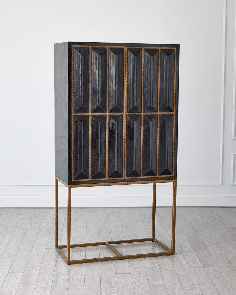 Elevate your entertaining with the Horn Inlay Bar Cabinet, a beautiful display of craftsmanship and artistry. Each piece of buffalo horn is meticulously handapplied by skilled artisans, creating a stunning mosaic effect. The cabinet's iron frame boasts an antiqued brass finish, while the beveled mirror, two drawers, and adjustable tempered glass shelves add functionality and sophistication. Handcrafted of iron, buffalo horn, tempered glass, and marble Overall, approx. 40"W x 19.75"D x 75"T Drawer interiors, 13.74"W x 14.82"D x 4.75"T Glass shelves, 36.75"W x 14.82"D Marble shelf, 37"W x 16.63"D Shelf weight capacity, 20 lbs Includes hardware Weight, 330.0 lbs Imported Boxed weight, approximately 458.0 lbs