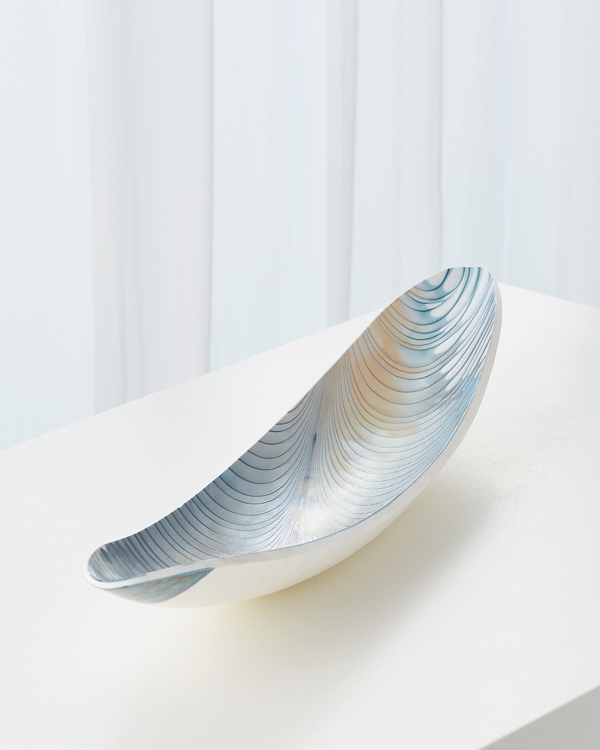Italian glass artisans on the island of Murano form these oneofakind art glass items utilizing a centrifuge process that spins molten glass in large copper bowls of various sizes. The shapes are formed after the glass stops spinning and the artisans begin to shape, mold, cut, and reheat the glass into the shapes you see here. After a long annealing process, the glass is cool, stable, and able to be packed and prepared to ship. Handcrafted decorative bowl. 26"W x 5.8"D x 3.3"T. Hand wash. Weight: 4.8 lbs. Made in Italy.