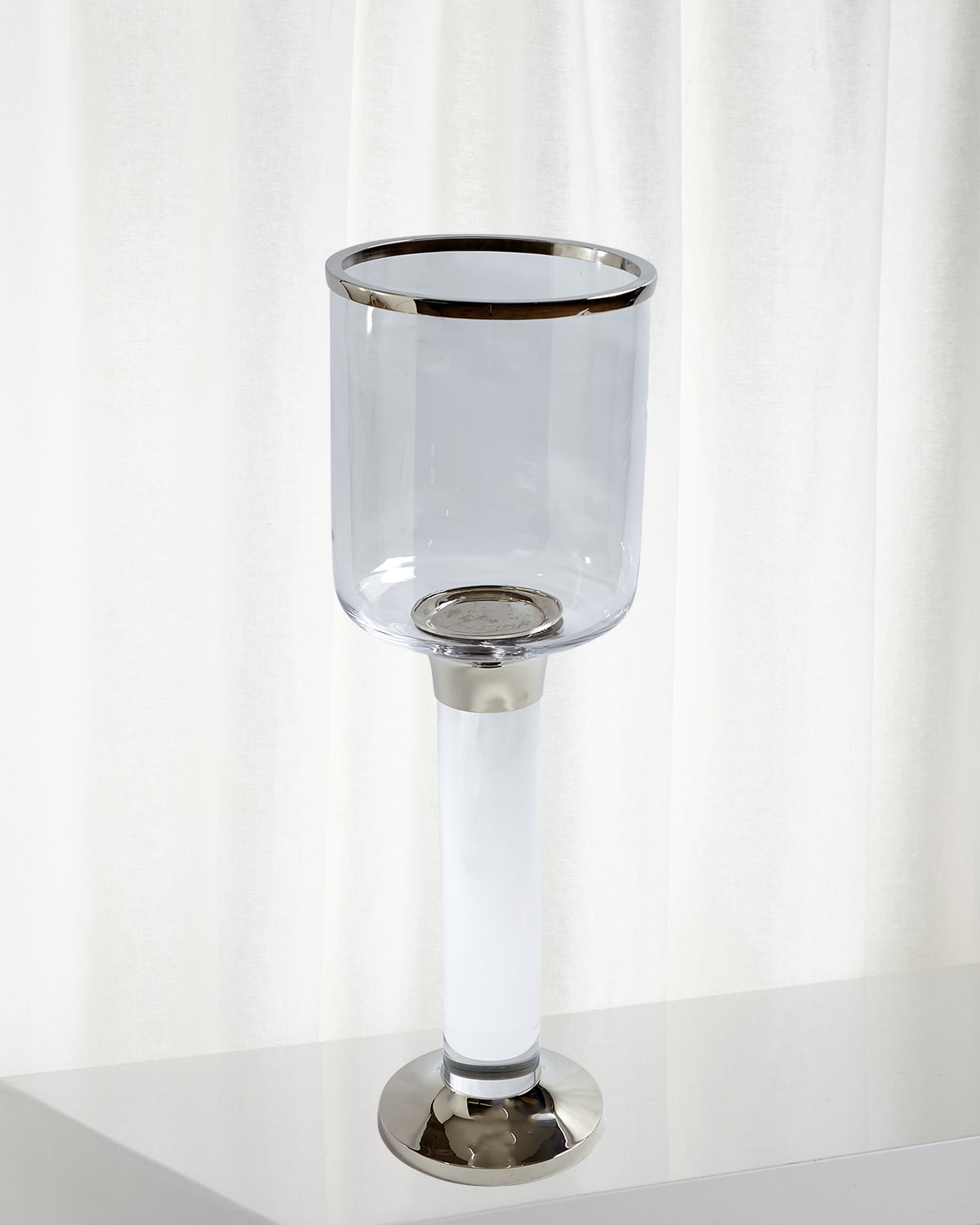 Solid acrylic column is highlighted between two nickel plated cups with a glass hurricane and a nickel plated rim to add a touch of elegance to your candles and interior. Holds a 4"Dia. pillar candle. 11"Dia. x 34.3"T. Hand wash. Imported.