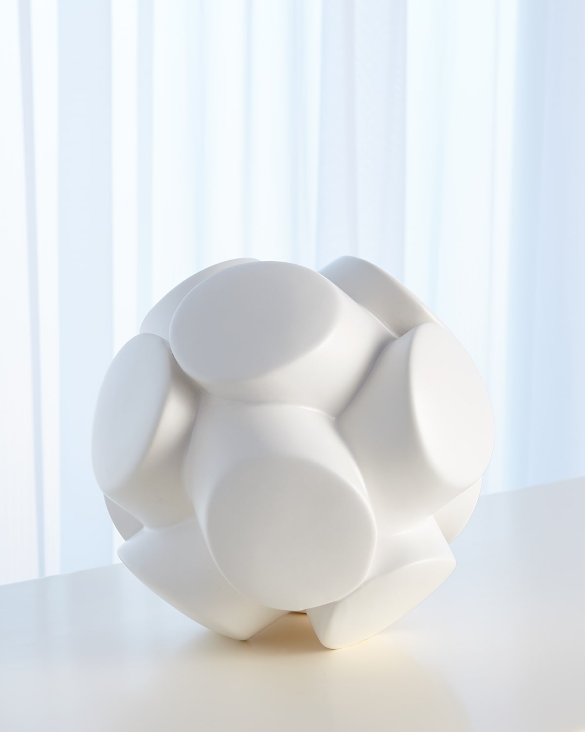 The Mayet sculpture is influenced by midcentury techniques. Equal parts a nod to the sputnik era and to the sculptors of the modernist era, it is the perfect addition to any surface, desk, or table. This true design object is designed to be used in all its sizes or as a single decorative accent. Made of ceramic. Overall: 8"Dia. x 8"T. Weight: 3.8 lbs. Dust with dry cloth. Imported. Boxed weight, approximately 5 lbs.
