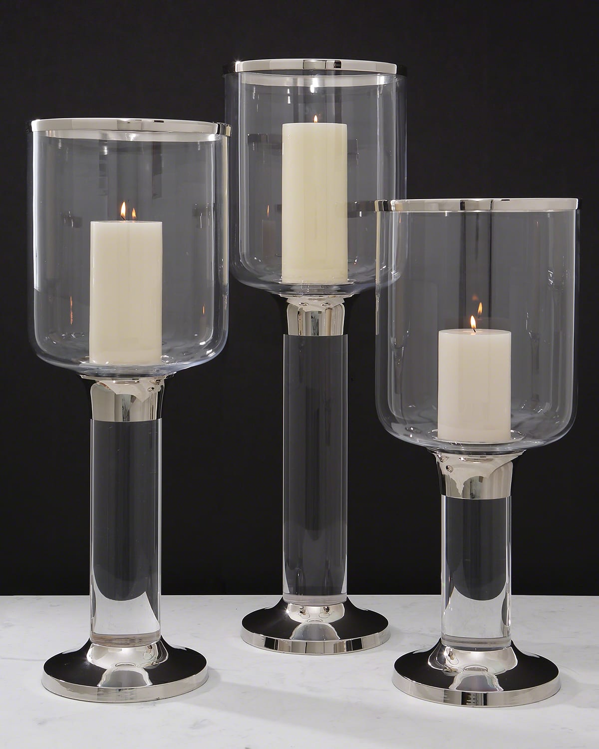 Solid acrylic column is highlighted between two nickel plated cups with a glass hurricane and a nickel plated rim to add a touch of elegance to your candles and interior. Holds a 4"Dia. pillar candle. 11"Dia. x 30.5"T. Hand wash. Imported.