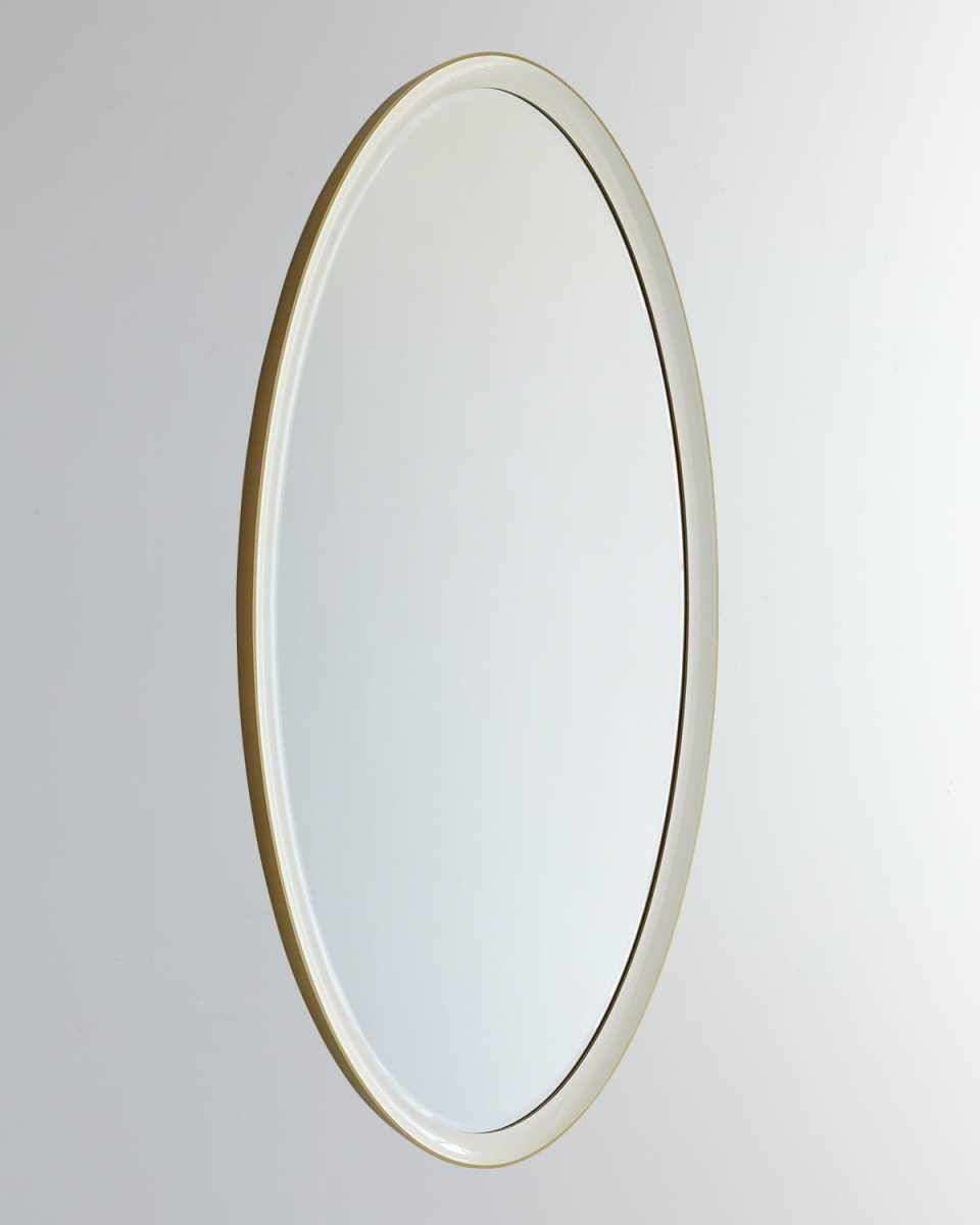 Ovalshaped mirror from the Roger Thomas Collection features highgloss lacquer and metallic ombre finish. A oneinch bevel surrounds the glass. Hangs with 24" metal wall cleat (provided). Overall, 35.5"W x 2.5"D x 63"T. Inner dimensions, 31.5"W x 1"D x 59"T. Wood composite/glass. Imported.