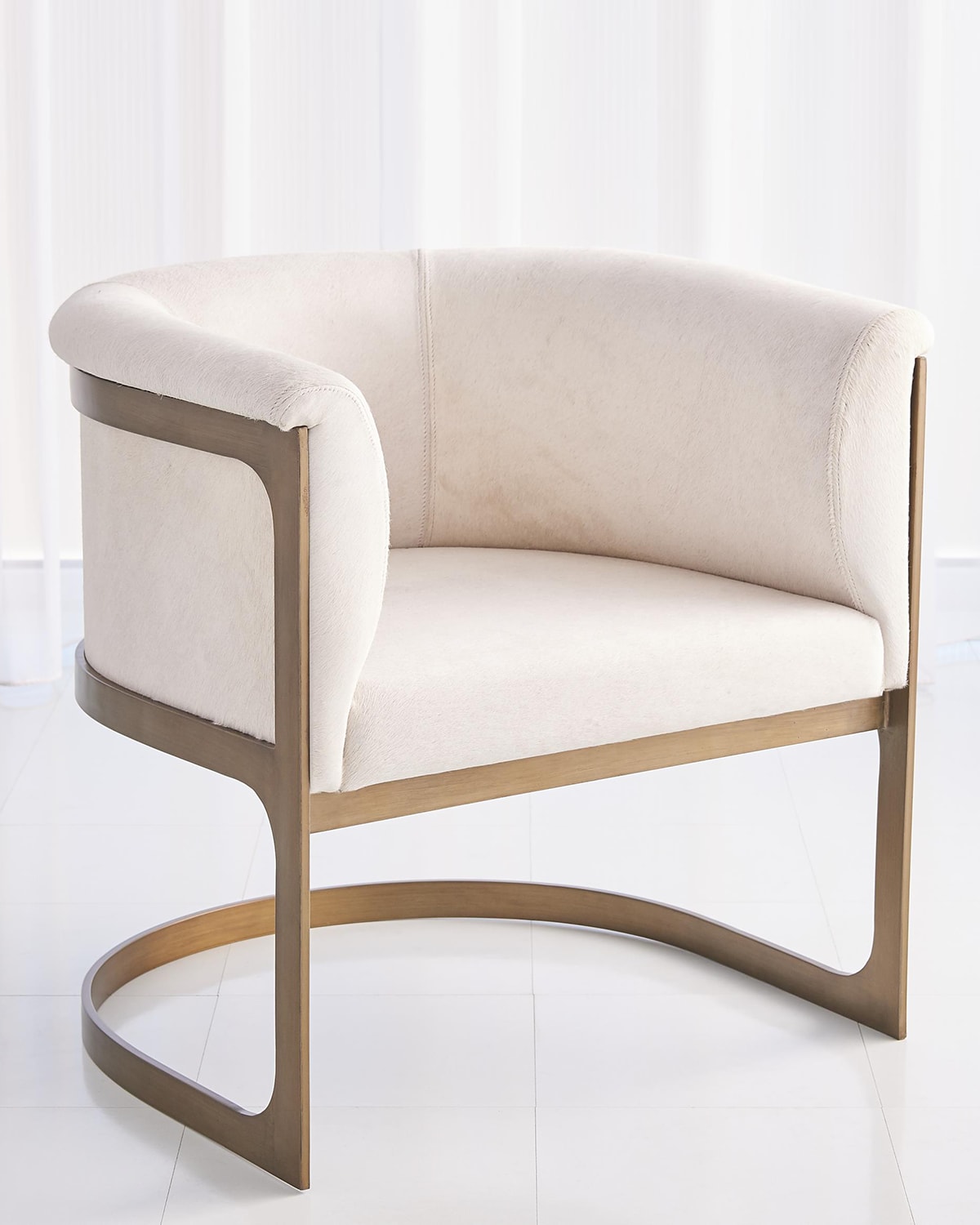 Handcrafted barrel chair. Metal frame in antiqued brass finish. Dyed hair on hide (India). Mango and plyboard seat frame. 28"W x 25"D x 27"T. Arm height, 27". Seat height, 16.5". Seat depth, 21". Imported. Boxed weight, approximately 85 lbs.