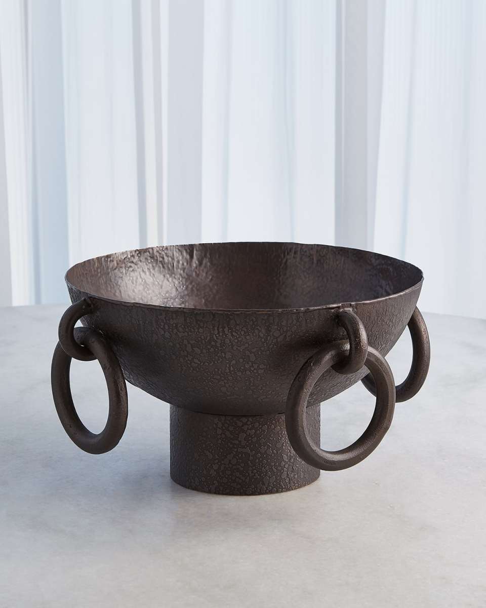 The Ring Handled Collection is handcrafted of iron with a textured finish Features handapplied ring accents Not food safe Watertight Approx. 16.5"Dia. x 8.5"T Item Weight (Lbs.): 10.5 Wipe clean Imported
