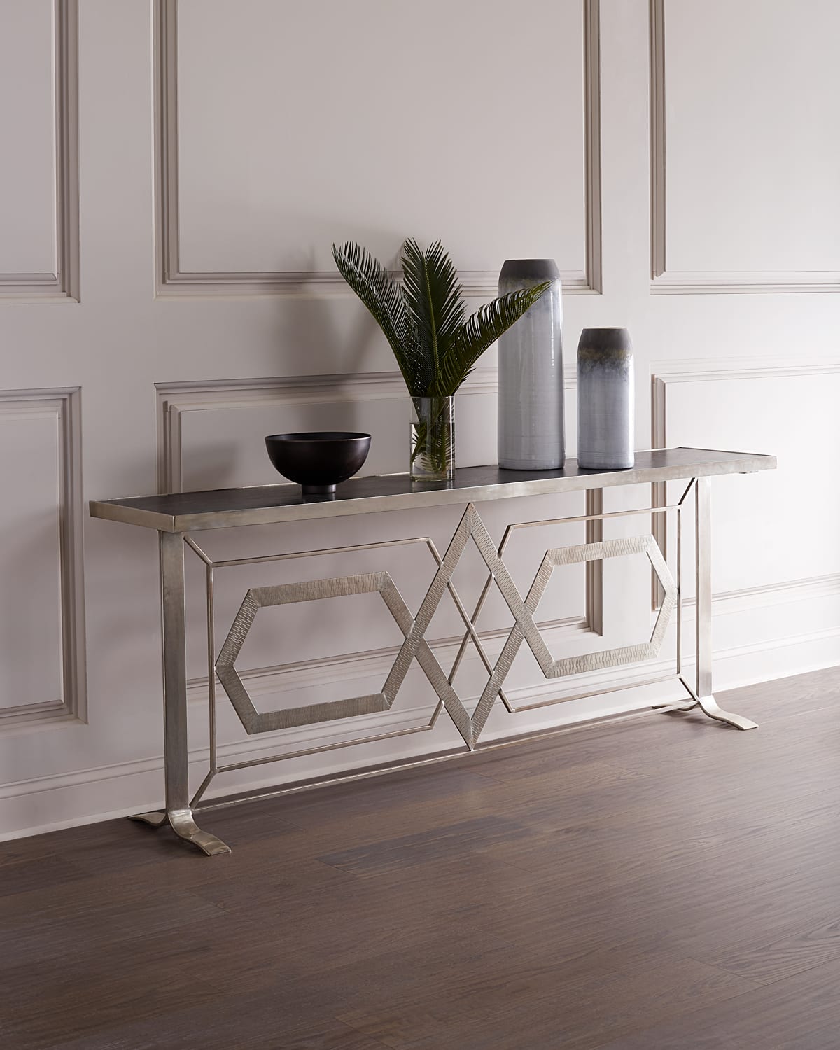 Handcrafted console table. Made of nickel plated iron with a rough black marble top. Overall: 84"W x 16"D x 32.5"T. Dust with dry cloth. Imported. Boxed weight, approximately 283 lbs.