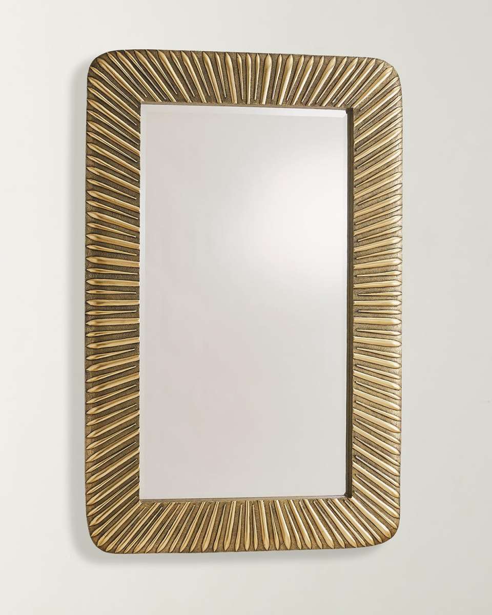 The Valencia mirror borrows inspiration from classic Spanish design. Done in brass with an antique brass finish, this stately piece is sure to turn heads. Made of mirror, brass, and wood composite Approx. 36"W x 56"T Reflective area, approx. 24" x 44" Imported Item weight, approx. 68.0lbs. Boxed weight, approx. 82 lbs.