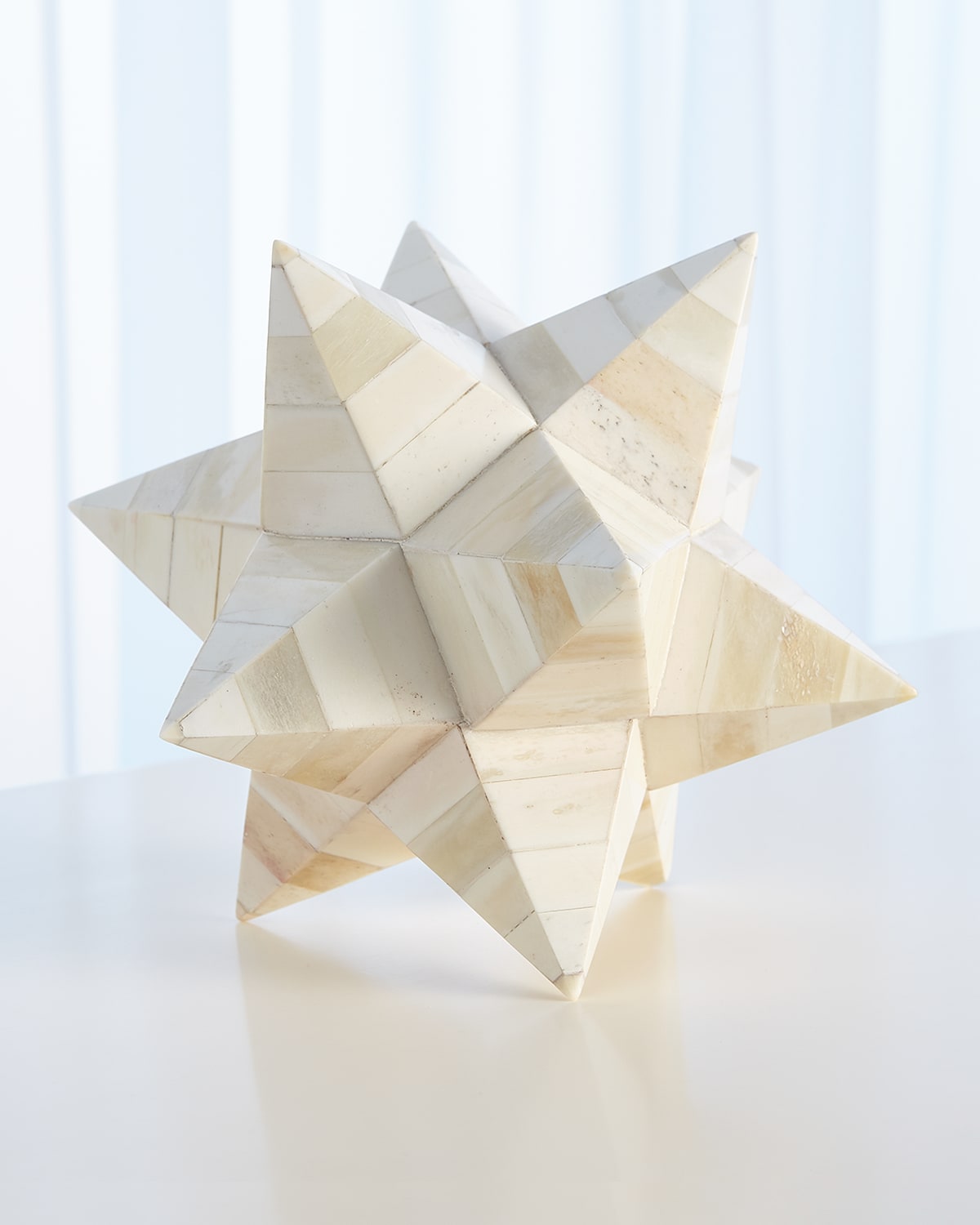 Our Stellated Dodecahedron features a wood composite substrate and bone veneer. The Stellated Dodecahedron is composed of 12 pentagrammic faces, with five pentagrams meeting at each vertex. Water buffalo bone from India. Overall: 7"W x 7"D x 7"T. Weight: 1.7 lbs. Dust with dry cloth. Imported.