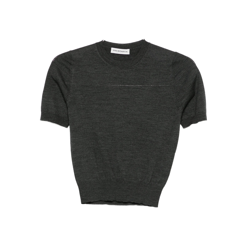 anthracite grey round neck short sleeves fine knit straight hem horizontal stripe detail