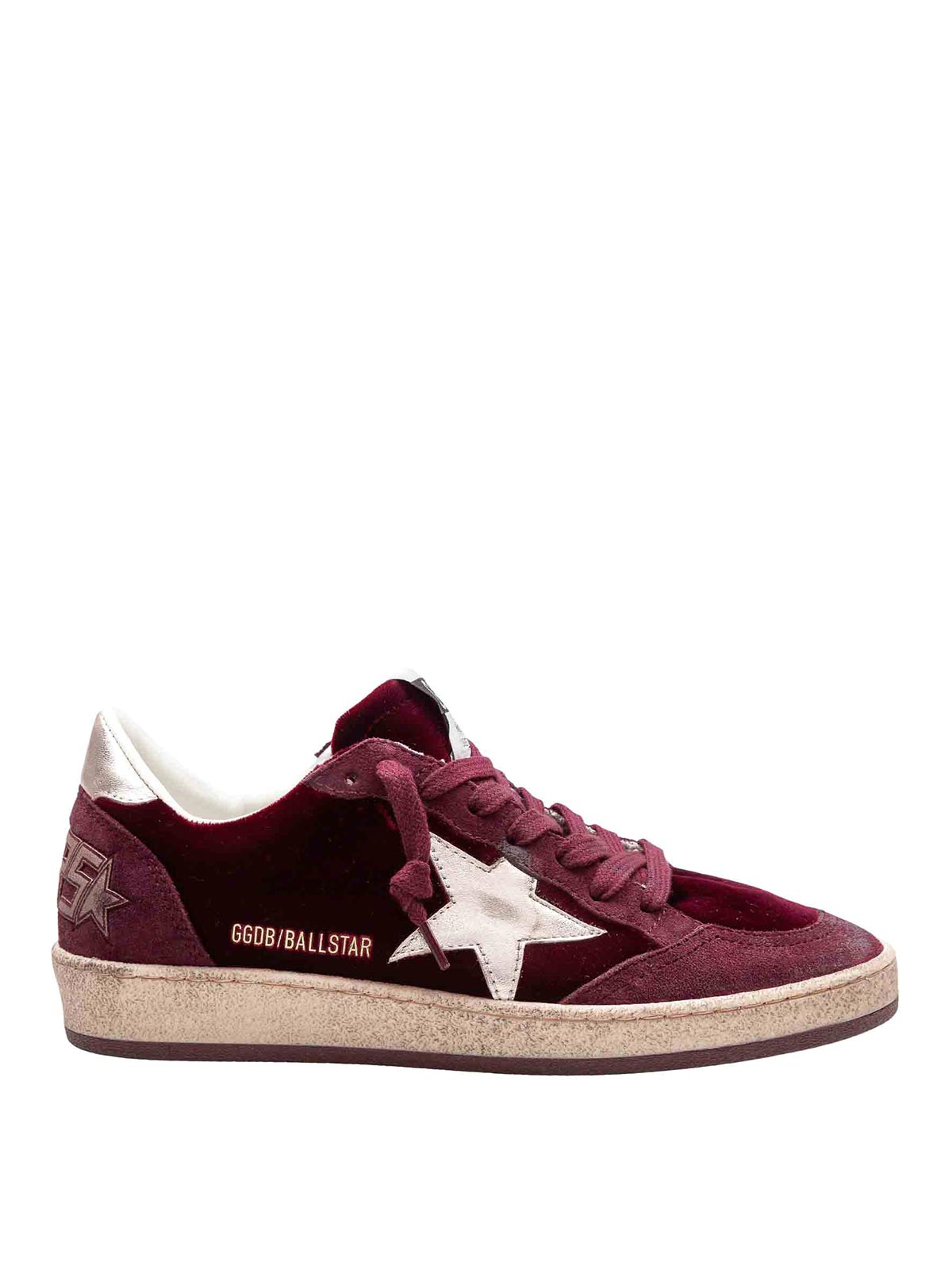 Sneakers en velours et étoile laminée dorée, talon laminé doré, lacets bordeaux, effet vintage