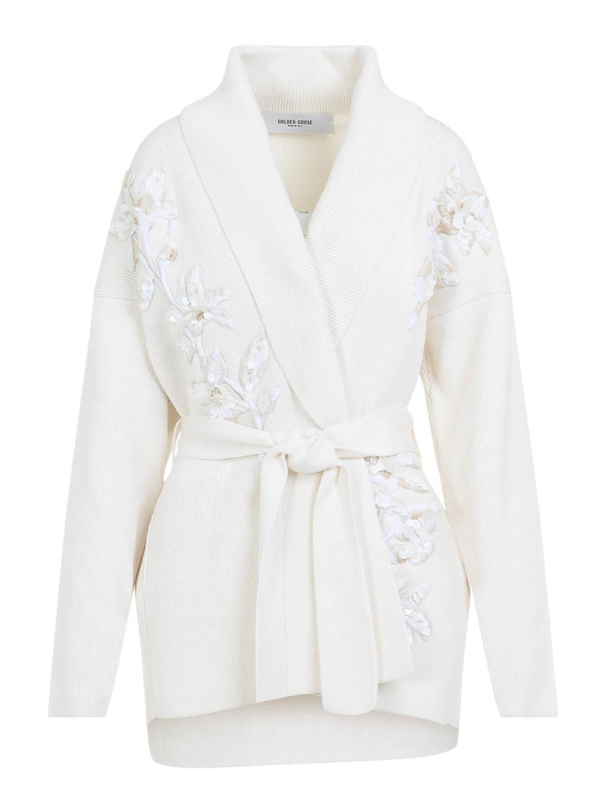 Cardigan blanc en maille ceinturée Golden Goose confectionné à partir d'un col châle blanc côtelé, fermeture amovible, ceinture à nouer, épaules tombantes, manches longues, fleurs brodées ornées de paillettes, poches latérales non doublées