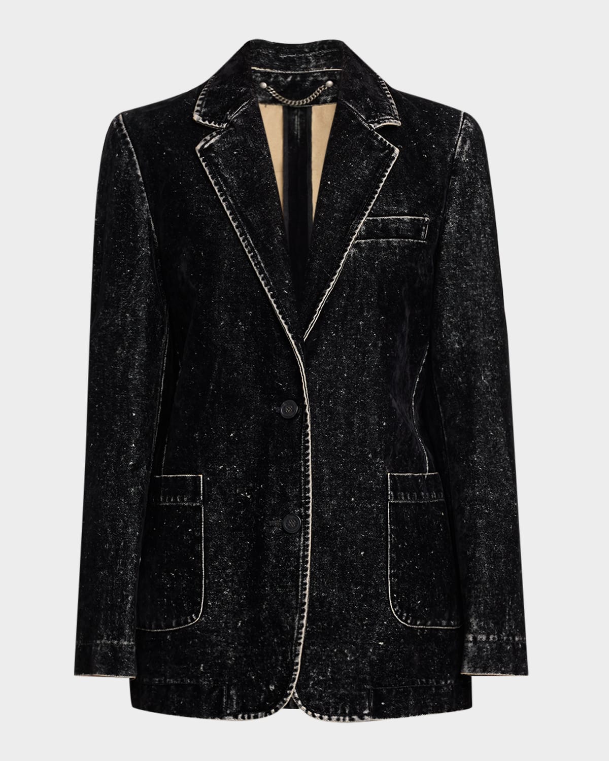 From the Golden Goose "Journey" collection, this jacket is crafted in velveteffect denim with a distressed finish. Notch lapels Singlebreasted front Long sleeves Chest welt pocket Hip patch pockets Classic fit Buttonfront Cotton Dry clean only Made in Italy