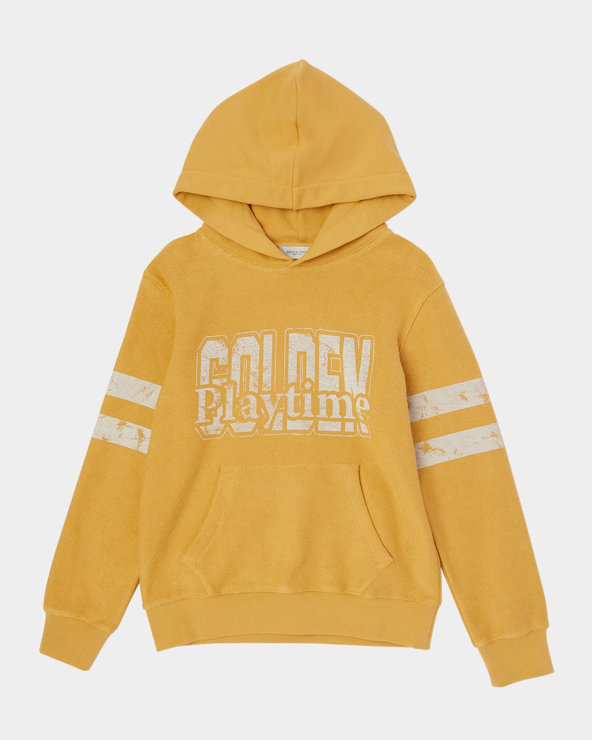 Golden Goose hoodie from the Journey collection features logo graphic print and varsity sleeve stripes Hooded Long sleeves Front kangeroo pocket Banded cuffs and hem Pullover style Cotton/polyester Lining: Cotton Made in Italy