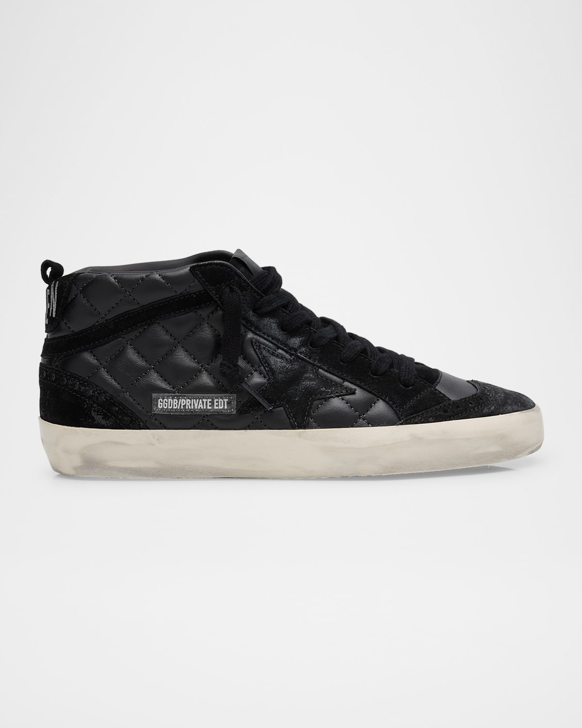 Golden Goose midtop sneakers in quilted nappa leather with suede trim Flat heel Round wingtip toe Laceup vamp Logo on tongue and backstay Lining: Leather/cotton Signature stained rubber outsole Made in Italy