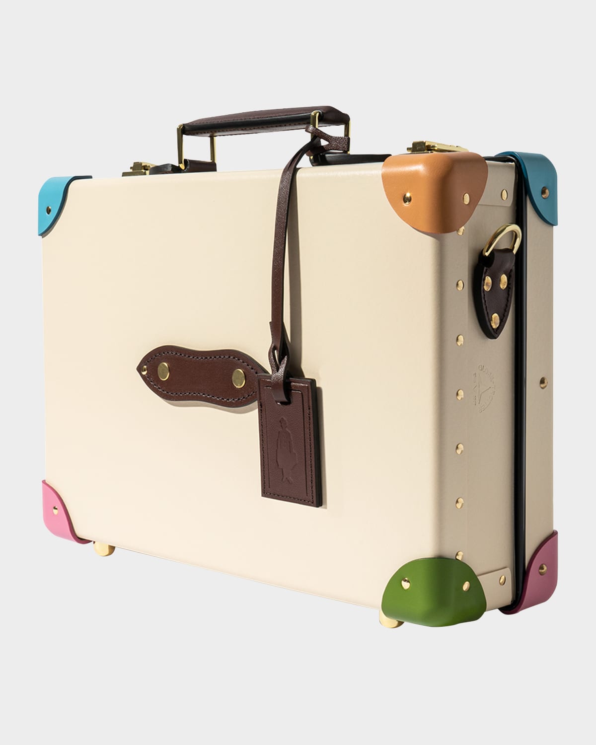 GOLF le FLEUR* hardshell attache case in travel trunk style Features luggage tag embossed with logo Embossed top handle Detachable leather strap Two fliplock closures Metal feet at bottom Body, vulcanized fibreboard Trim, leather Approx. 9.5"H x 13.5"W x 4"D Handcrafted in the United Kingdom