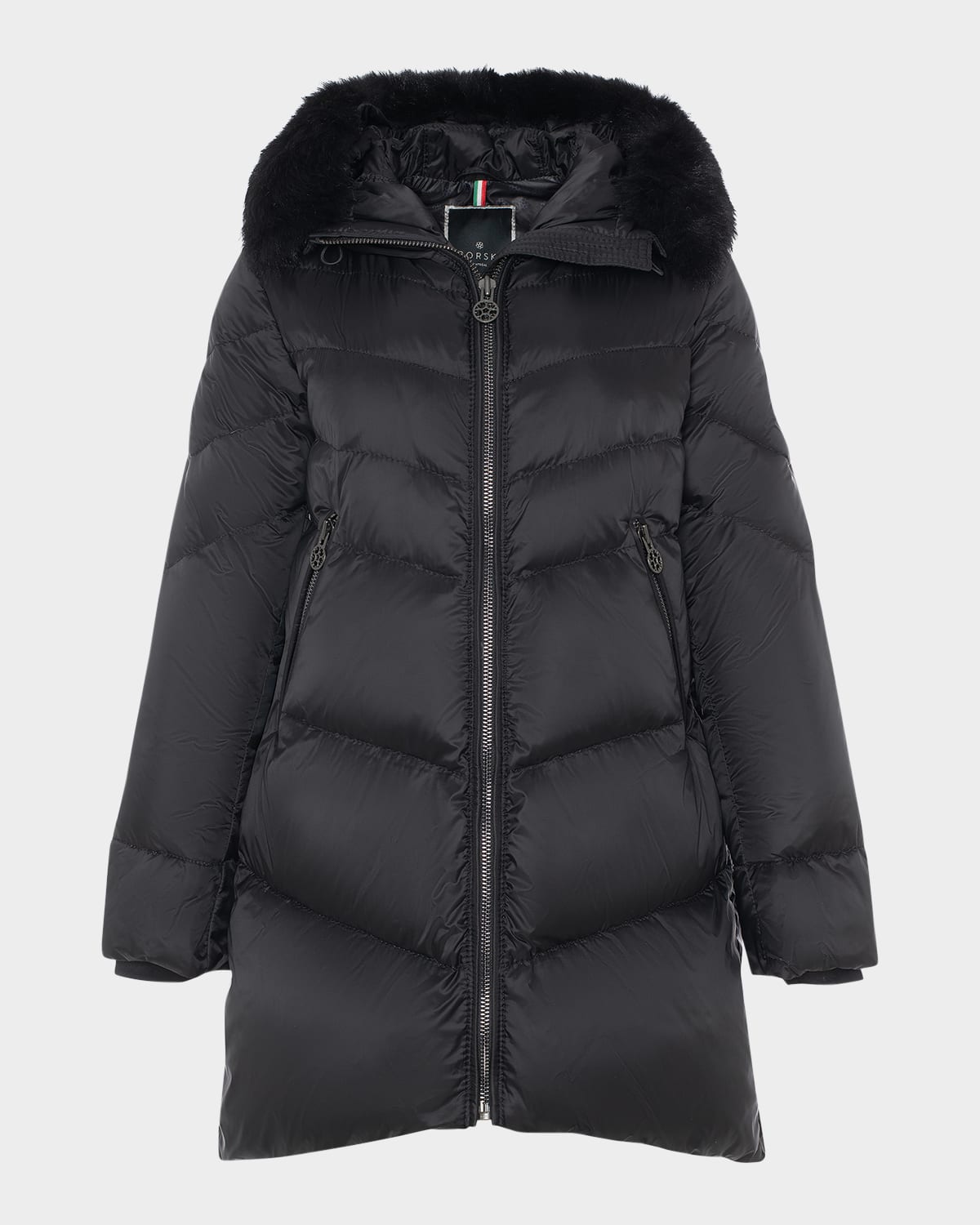 Gorski ApresSki jacket featuring a detachable dyed Toscana lamb shearling (Spain) hood trim Approx. 35"L from shoulder to hem Drawcord hooded neckline; zip front Long sleeves; banded cuffs Logo patch on the left shoulder Hip zip pockets Straight fit Hem falls below the hip Nylon/polyamide Lining: Polyester Fill: Down Professional cleaning recommended Made in Italy