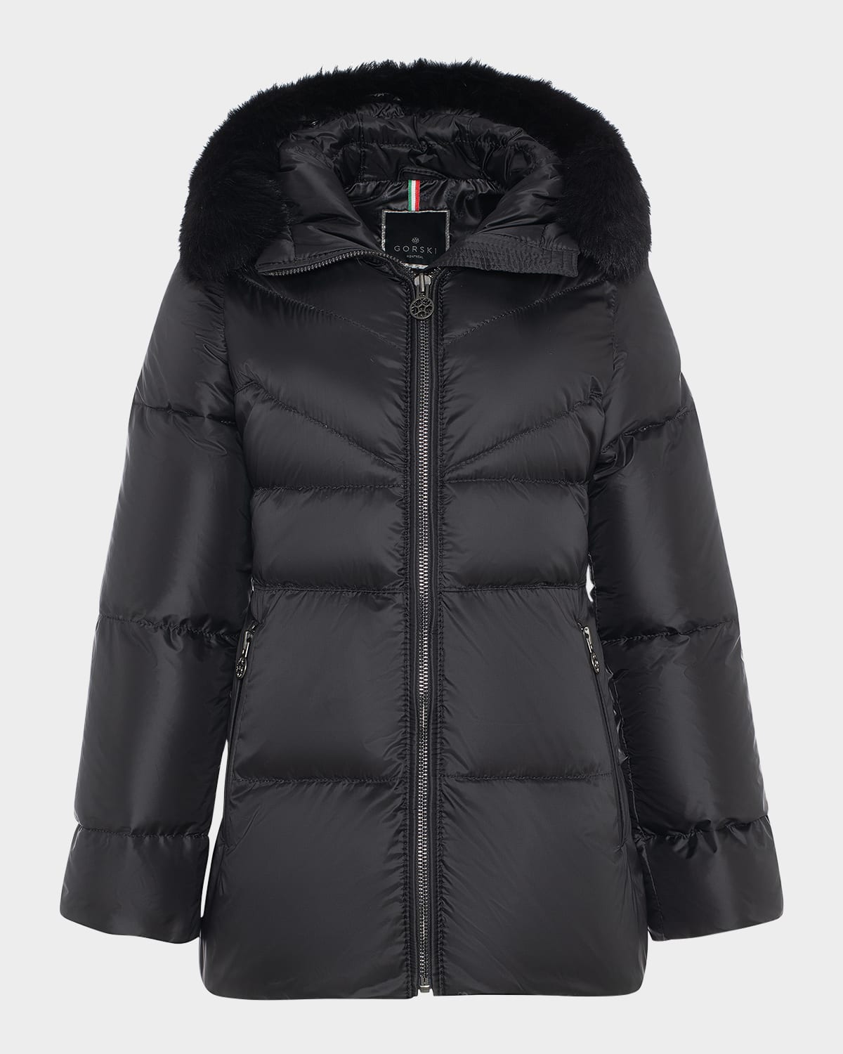 Gorski ApresSki jacket featuring a detachable dyed Toscana lamb shearling (Spain) hood trim Approx. 27"L from shoulder to hem Drawcord hooded neckline; zip front Long sleeves; banded cuffs Logo patch on the left shoulder Hip zip pockets Straight fit Hem falls below the hip Nylon/polyamide Lining: Polyester Fill: Down Professional cleaning recommended Made in Italy