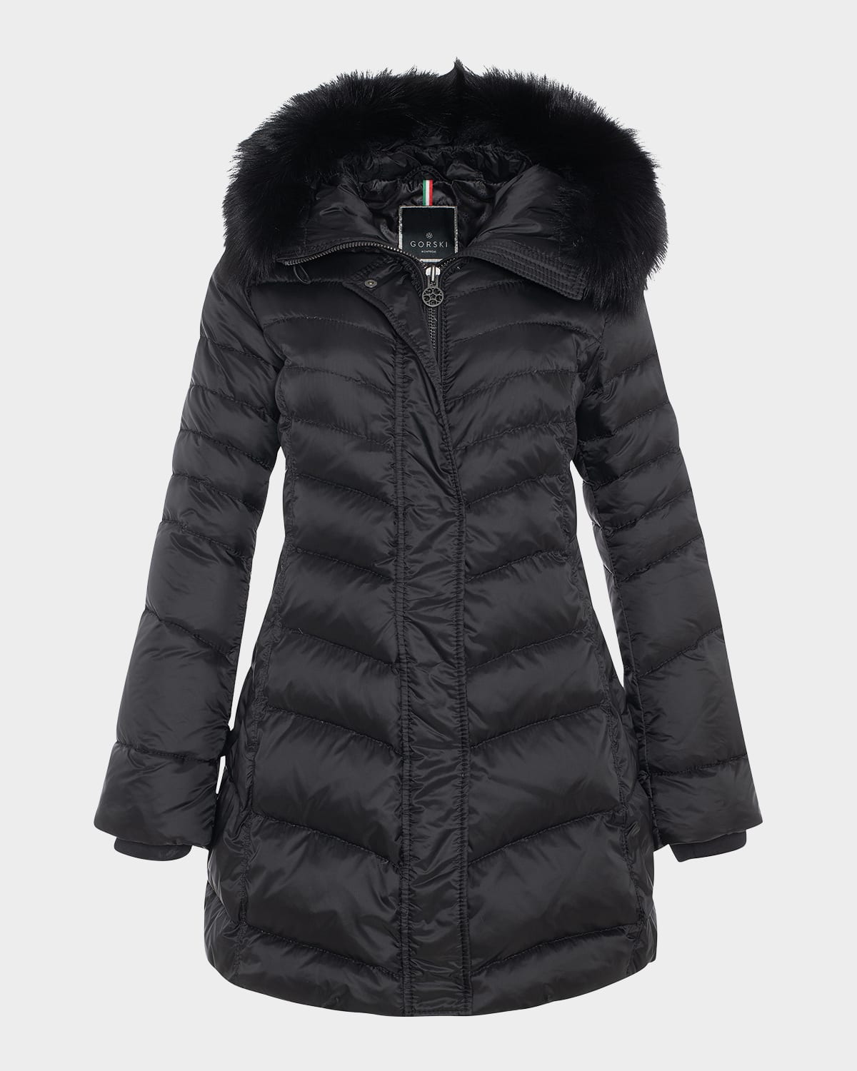 Gorski ApresSki jacket featuring a detachable dyed Toscana lamb shearling (Spain) hood trim Approx. 33"L from shoulder to hem Drawcord hooded neckline; concealed zip front Long sleeves; banded cuffs Logo patch on the left sleeve Side zip pockets Slim fit Hem falls below the hip Drawcord cinched hem Nylon/polyamide Lining: Polyester Fill: Down Professional cleaning recommended Made in Italy