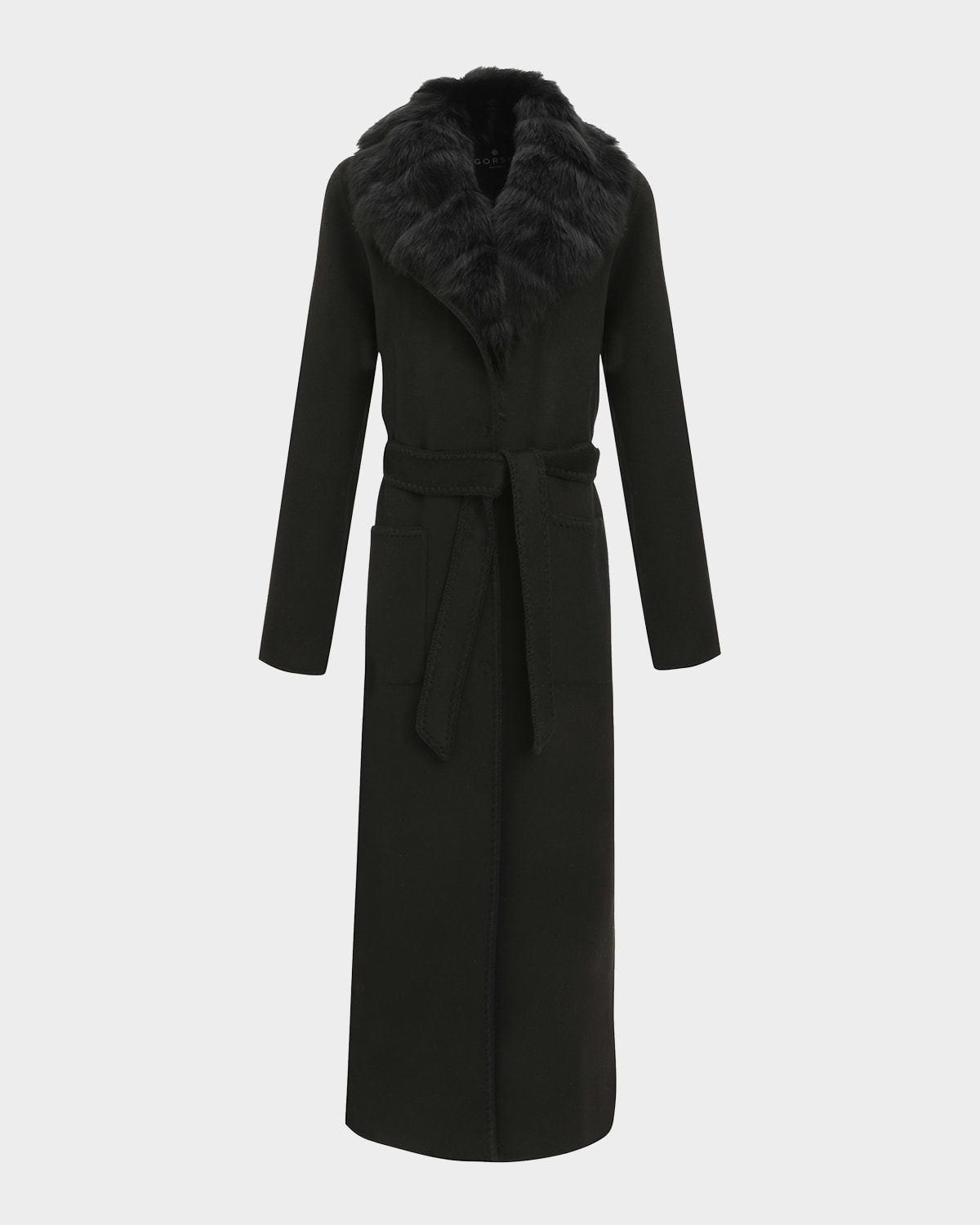 Gorski cashmerewool coat enhanced with a detachable dyed Merinillo lamb shearling (Spain) collar Features embroidered trim Long sleeves Selftie belt Patch pockets Classic fit Side slit hem Concealed snapfront Wool/cashmere/shearling Lining: Cashmere/wool Professional cleaning recommended Imported