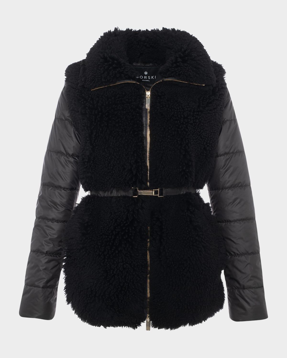 Gorski dyed curly lamb shearling (Spain) jacket enhanced with quilted sleeves and back panel Stand collar; twoway zipfront Long sleeves Adjustable, removable belt Side pockets Classic fit Hem falls to the hip Polyester/shearling Lining: Polyester Professional cleaning recommended Imported