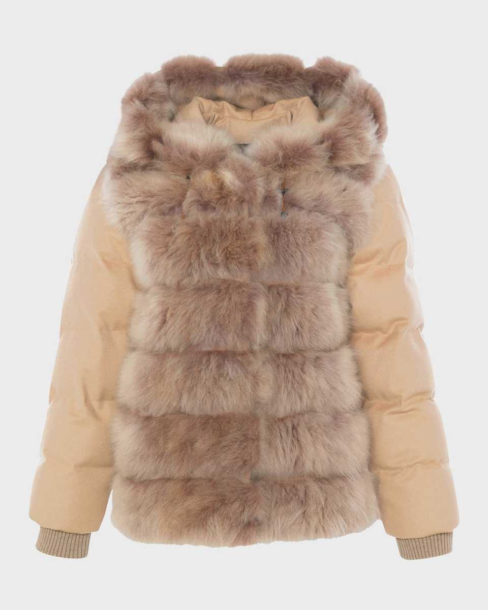 Gorski cashmere quilted down parka jacket featuring horizontal dyed cashmere goat (China) front and hood Approx. 27"L from shoulder to hem Drawstring hooded neckline; concealed snap front Long sleeves; ribbed cuffs Regular fit Cashmere Lining: Silk Fill: Down Professional cleaning recommended Made in Italy