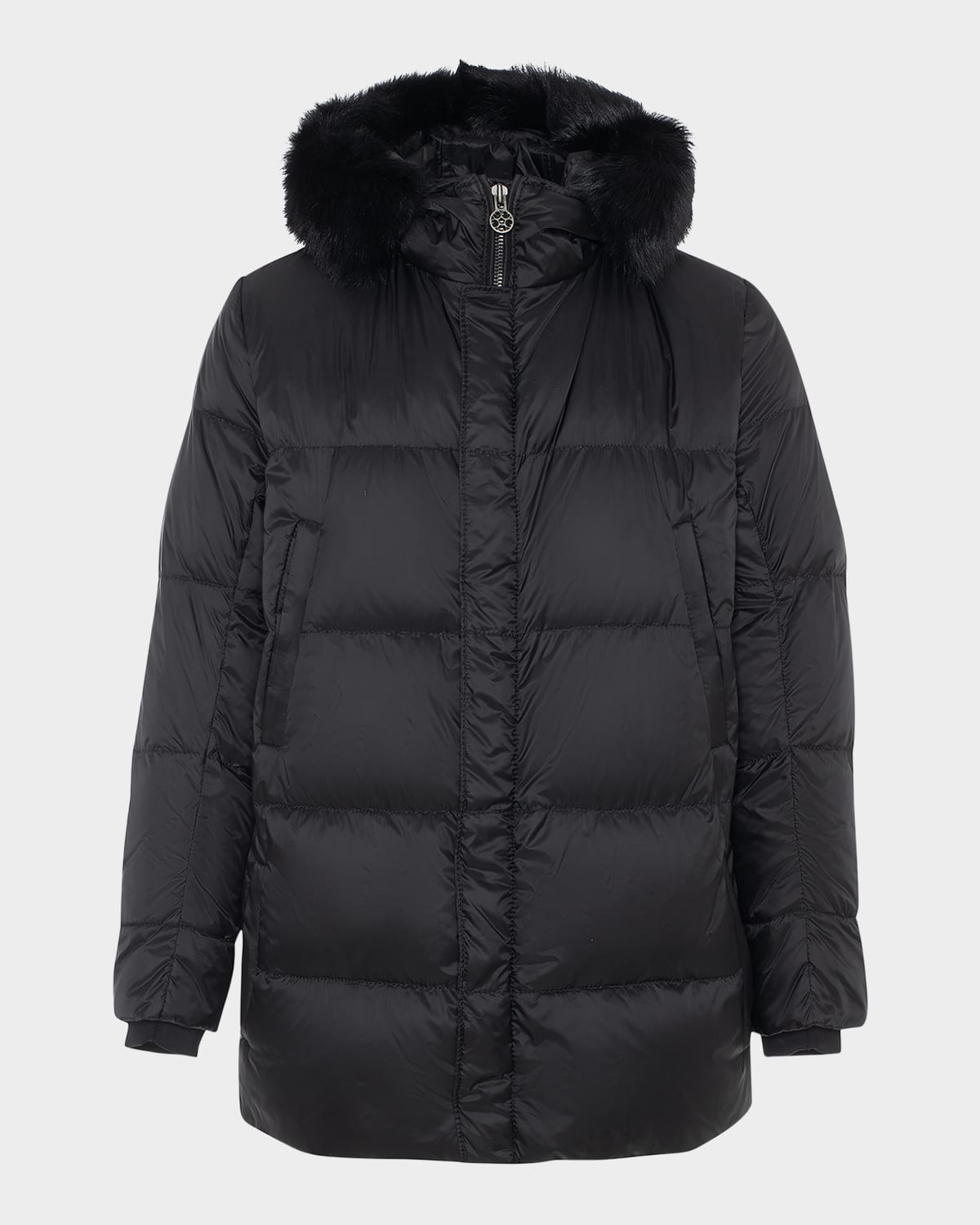 Gorski ApresSki padded jacket featuring a detachable dyed toscana lamb shearling (Spain) hood trim Approx. 32"L from shoulder to hem Hooded neckline; snapconcealed zip front Long sleeves; banded cuffs Chest welt pockets Side split pockets Regular fit Hem falls below the hip Nylon/polyamide Lining: Polyester Fill: Down Professional cleaning recommended Made in Italy