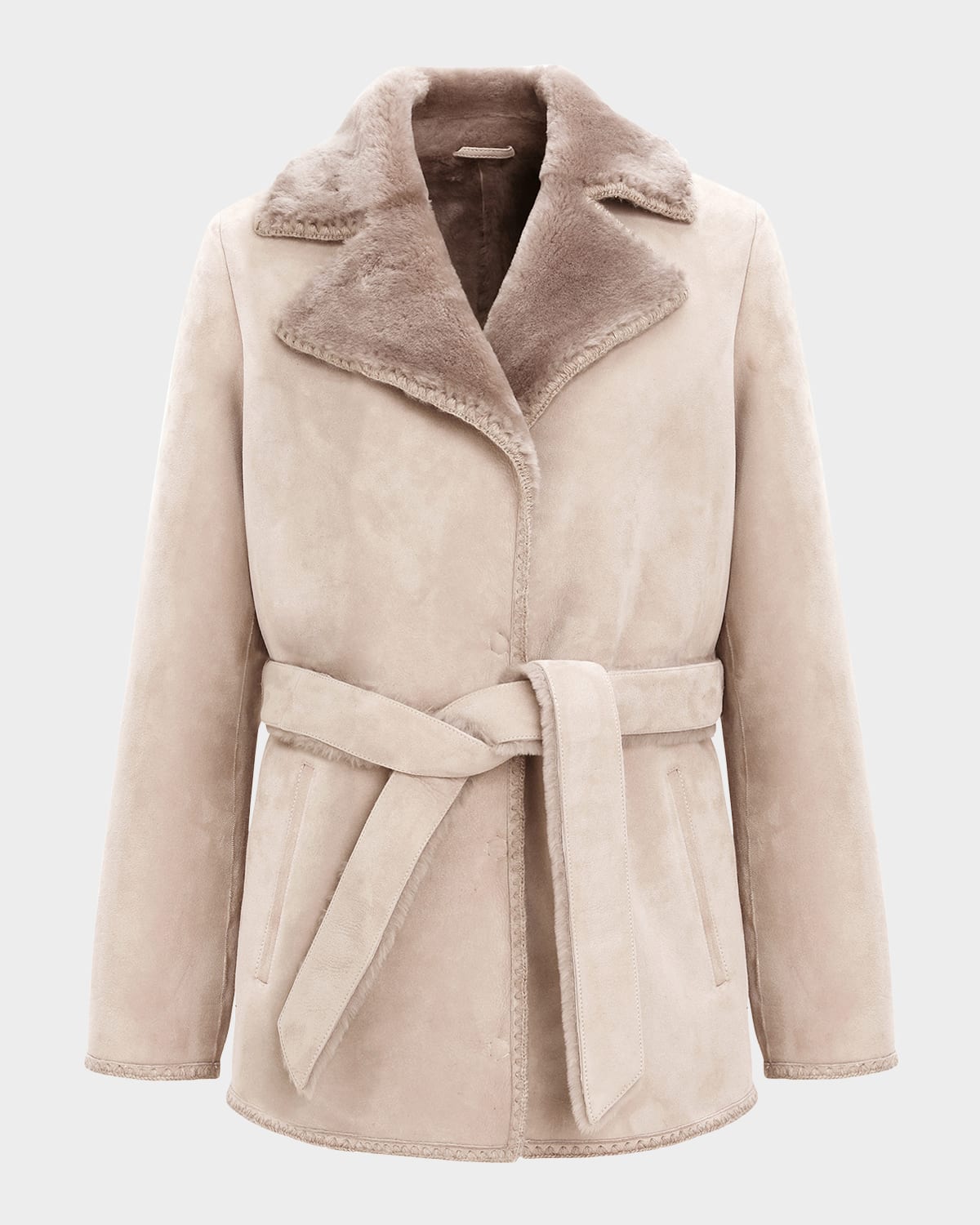 Gorski jacket in dyed Merino lamb shearling (Spain) with whipstitch trim and a self belt Approx. 28"L from shoulder to hem Notch lapels; singlebreasted front Long sleeves Hip welt pockets Straight fit Hem falls below the hip Concealed snap front closure Shearling Lining: Shearling lined Professional cleaning recommended Imported