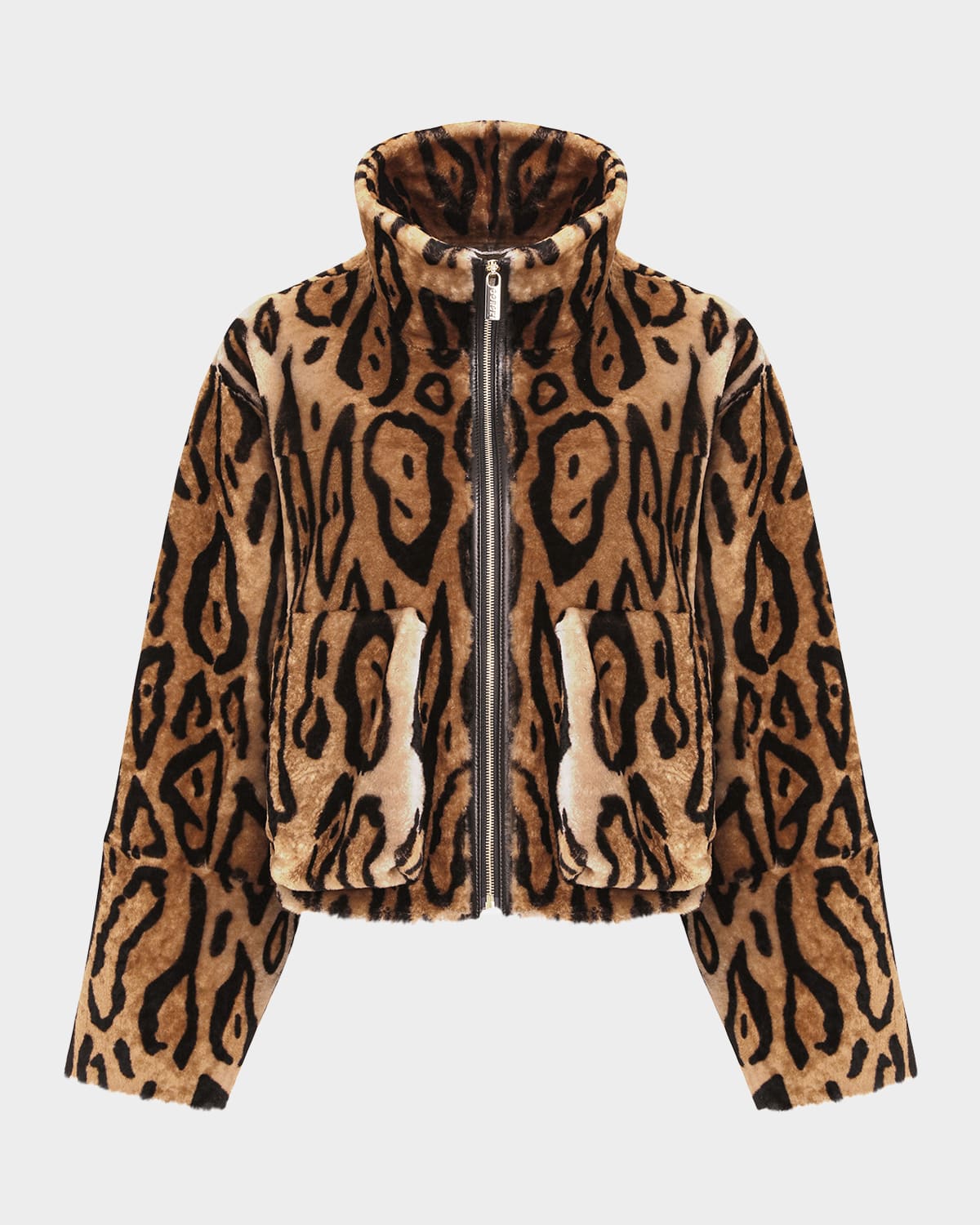 Gorski jacket in ocelot print dyed lamb shearling (South Africa) Approx. 20"L from shoulder to hem Stand collar; zip front Long sleeves Hip patch pockets Straight fit Hip length Shearling Lining: Shearling lined Professional cleaning recommended Imported