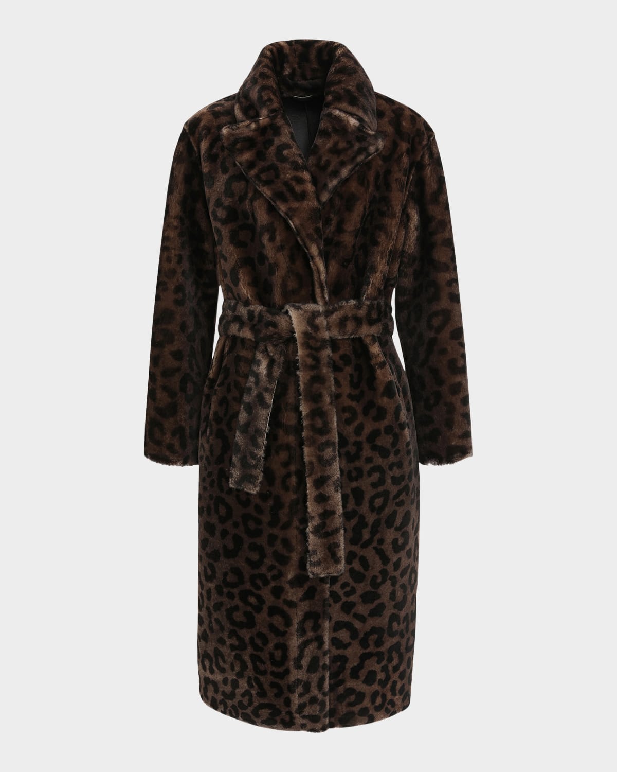 Gorski stroller coat reverses from leopardprinted dyed lamb shearling (South Africa) to solid leather Approx. 45"L from shoulder to hem Notch lapels Long sleeves Side slip pockets Straight fit Hem falls below the knee Snap closure Shearling Lining: Shearling lined Professional cleaning recommended Imported