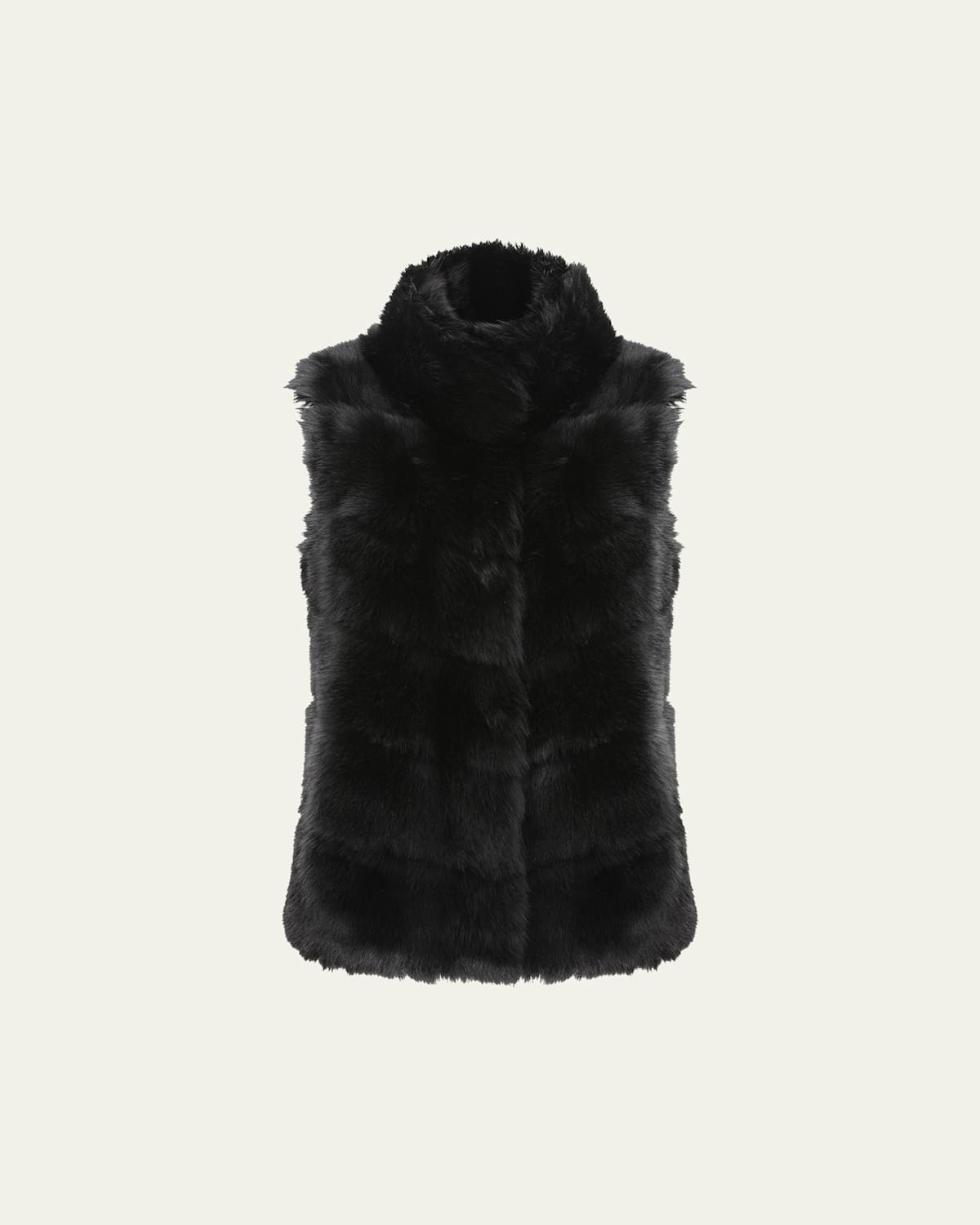 Gorski reversible dyed Merinillo lamb shearling fur (Spain) vest Approx. 26"L from shoulder to hem Stand collar; concealed snap closure Sleeveless Midlength Straight silhouette Shearling Lining: Shearling lined Professional cleaning recommended Imported