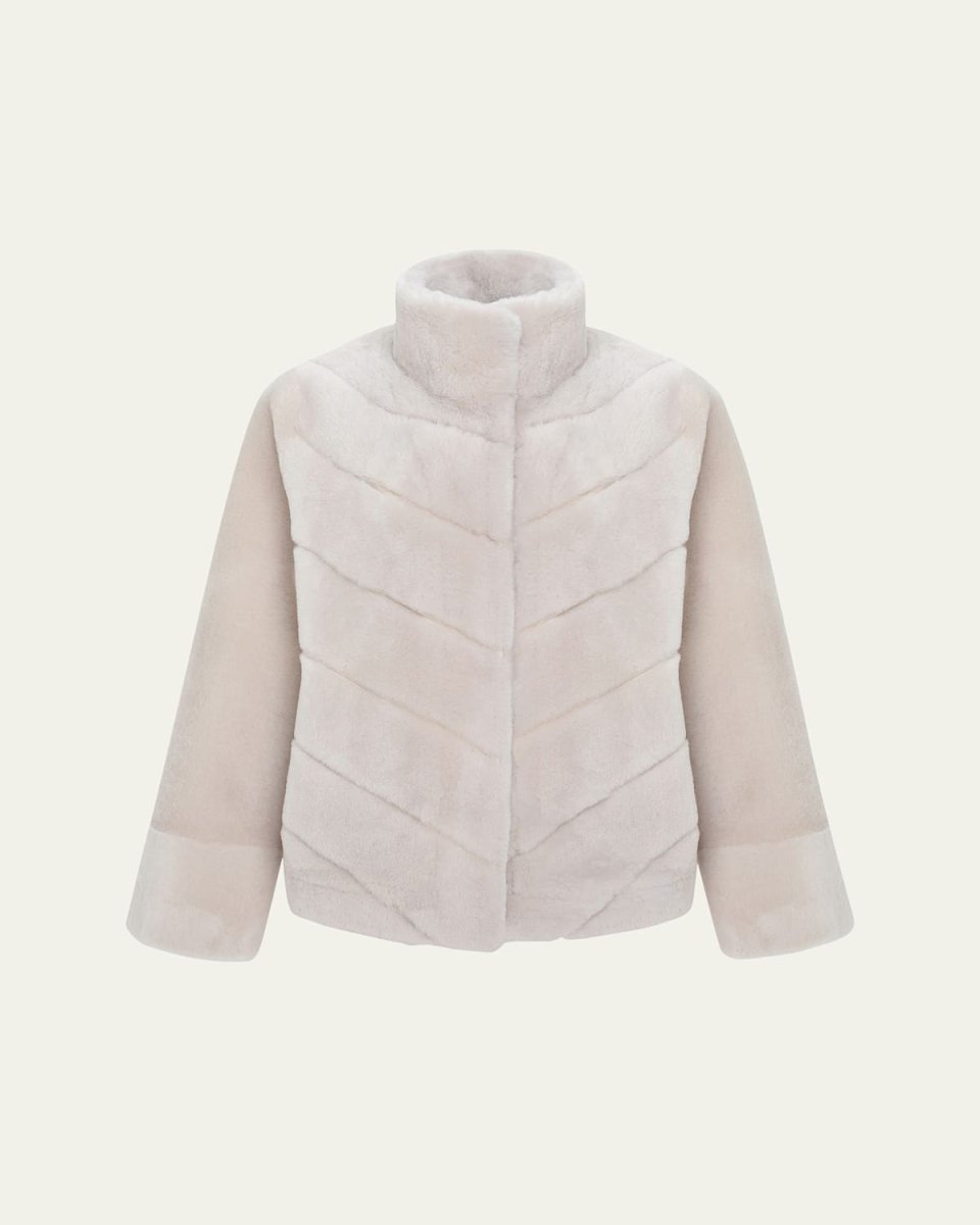 Gorski reversible chevronchanneled dyed Merino lamb shearling (Spain) jacket Approx. 24"L from shoulder to hem Stand collar; concealed snap closure Long sleeves Side slip pockets Hip length Straight fit Shearling Lining: Shearling lined Professional cleaning recommended Imported