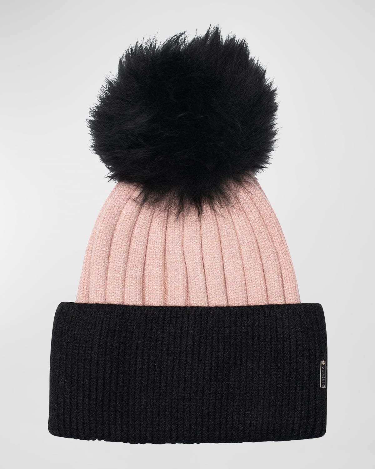 Gorski ribbed beanie in twotone polyester knit Features dyed Toscana lamb fur (Spain) pom Logo metal tag accent Imported