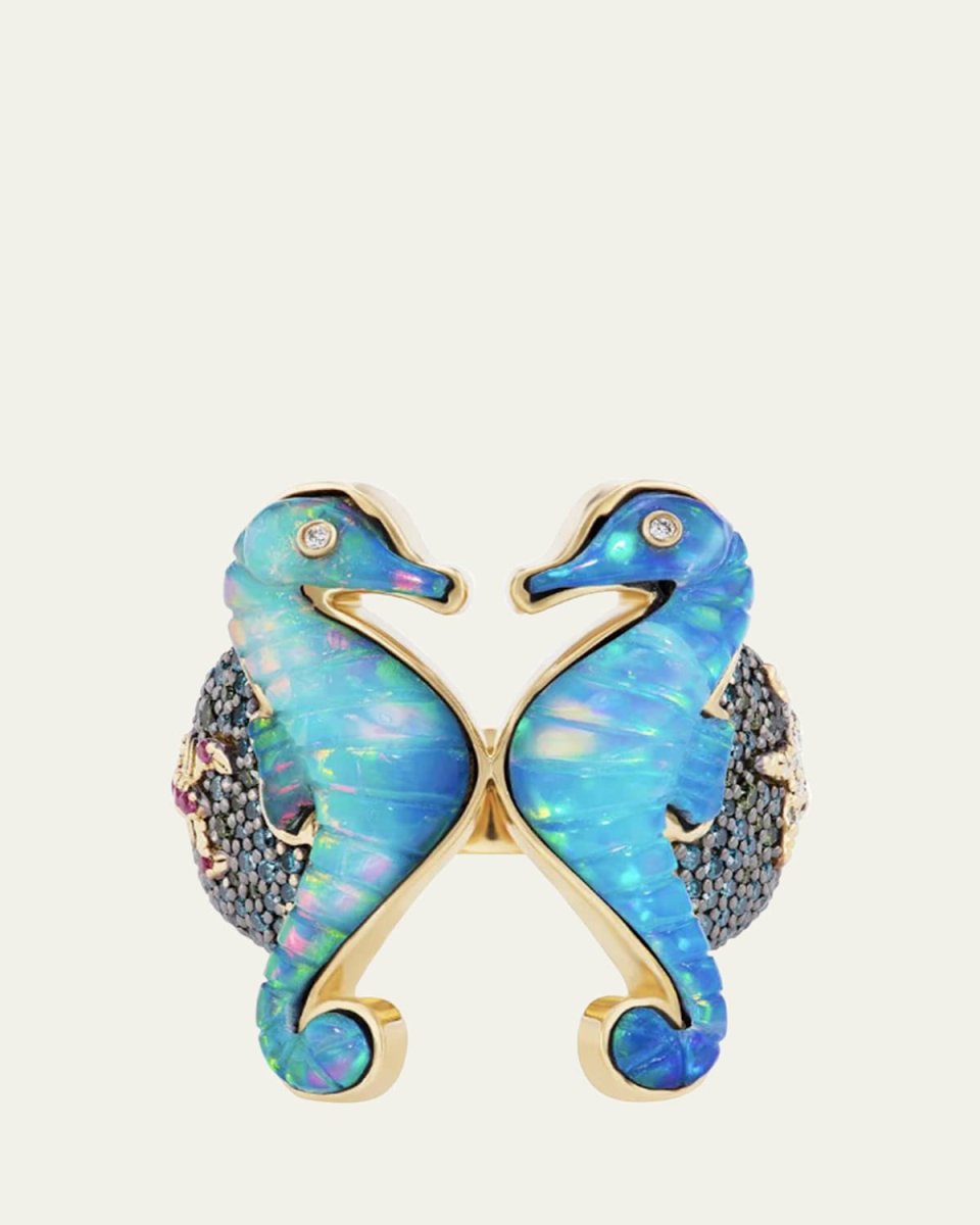 Coral is carved into a pair of seahorses for this Grace Winfrey ring. The shank of the ring is embellished with rubies and multicolor diamonds. Polished 18karat yellow gold 0.05 white diamond carat weight 0.34 green diamond carat weight 0.73 blue diamond carat weight 0.10 total ruby carat weight Made in USA