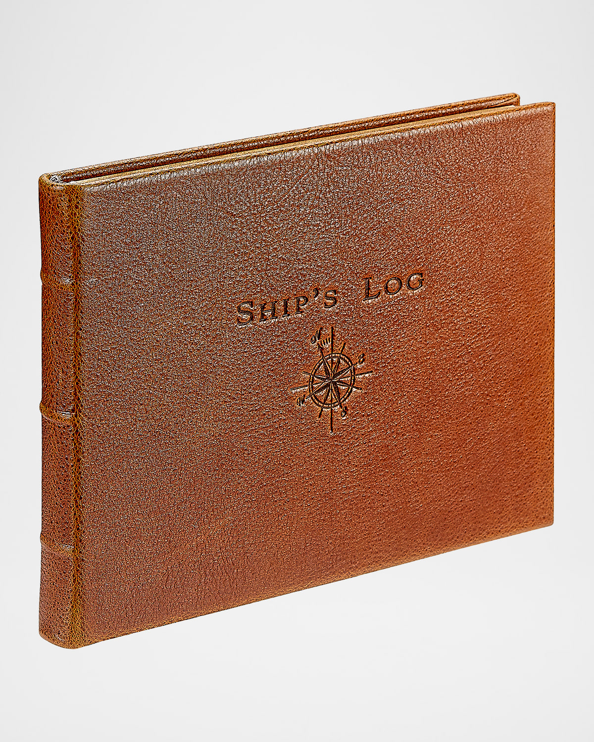 A classic captain's journal for trips on the high seas, this leather journal is perfect for recording all your adventures, including places visited, people, weather, waves, and crew. Leather cover with Smythsewn binding for strength and longevity Blindstamped with "Ship's Log" and a compass on the front cover 190 pages total; 162 entry pages and 28 fullcolor maps Ribbon bookmark Approx. 8.9"W x 6.75"T Wipe clean Made in USA
