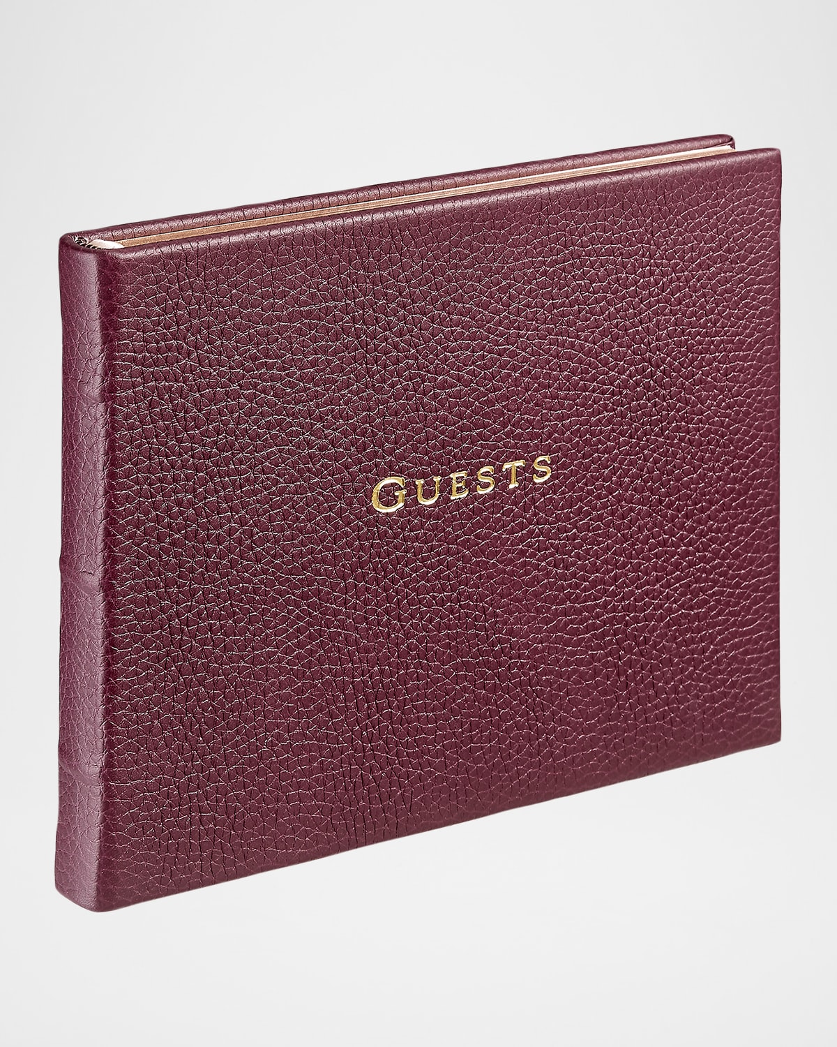 Suitable for many occasions, from weddings to business or social events, this elegant leather guest book sets the tone with enough room for your most important guests' signatures. Leather cover with Smythsewn binding for strength and longevity Blindstamped with "Guests" on the front cover 160 lined pages with gilt edges Satin ribbon marker Approx. 8.12"W x 6.75"T Wipe clean Made in USA