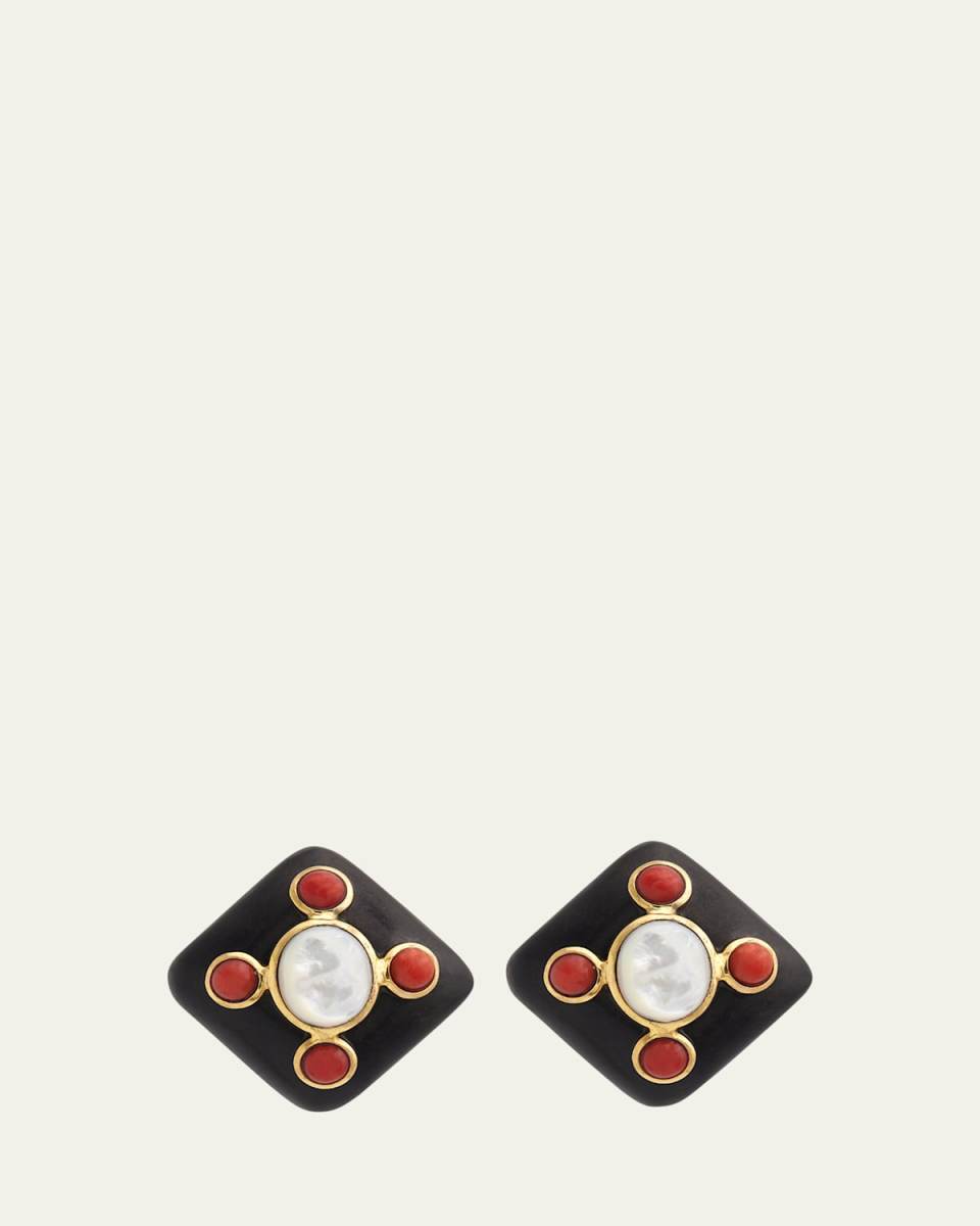 Grazia and Marica Vozza stud earrings 9karat yellow gold Blackcolored resin Bezelset oval motherofpearl Synthetic red resin stones Clipon backs Made in Italy