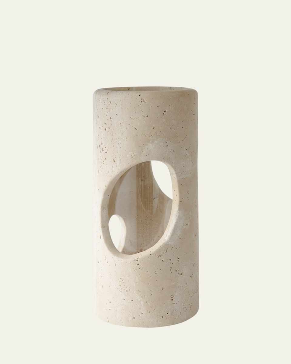 Inspired by the organic architecture of Australian coastlines, the Pietra Vase blends nature and craftsmanship through handcast forms and peekaboo cutouts that showcase flashes of green from floral stems. Handcrafted of travertine Approx. 4.7"L x 4.7"W x 11"T Item Weight (Lbs.): 1.6 Handle with care, wipe only with a soft cloth Glass insert is dishwashersafe Made in Australia