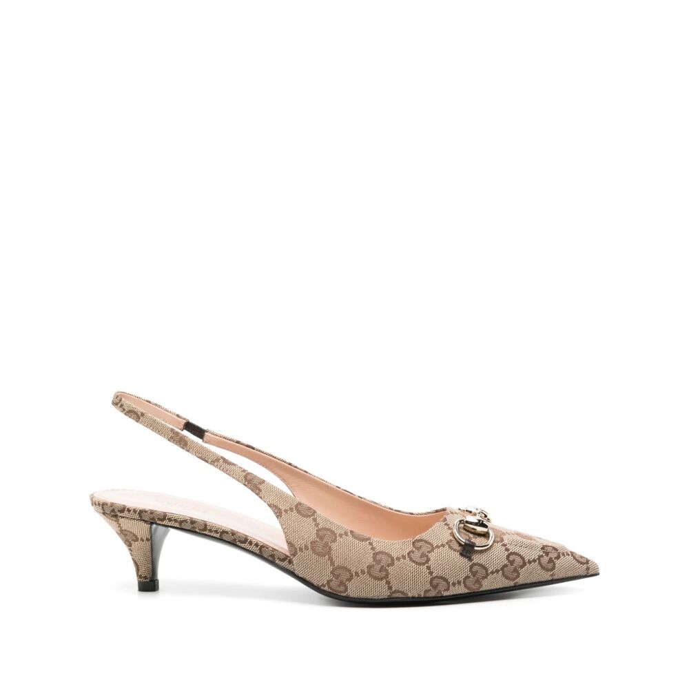 beige/brown GG Supreme canvas signature Horsebit detail pointed toe elasticated slingback strap branded footbed kitten heel leather sole This piece comes complete with a protective dust bag.